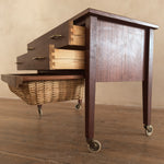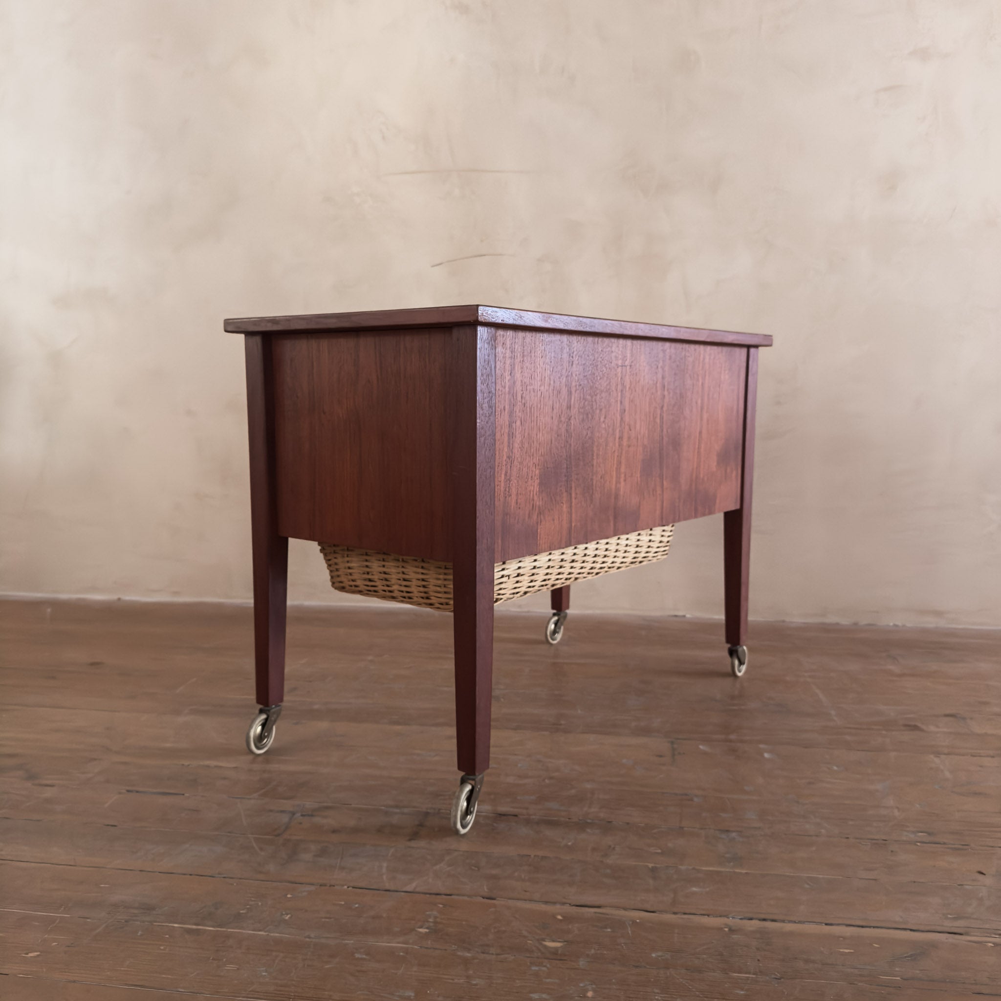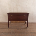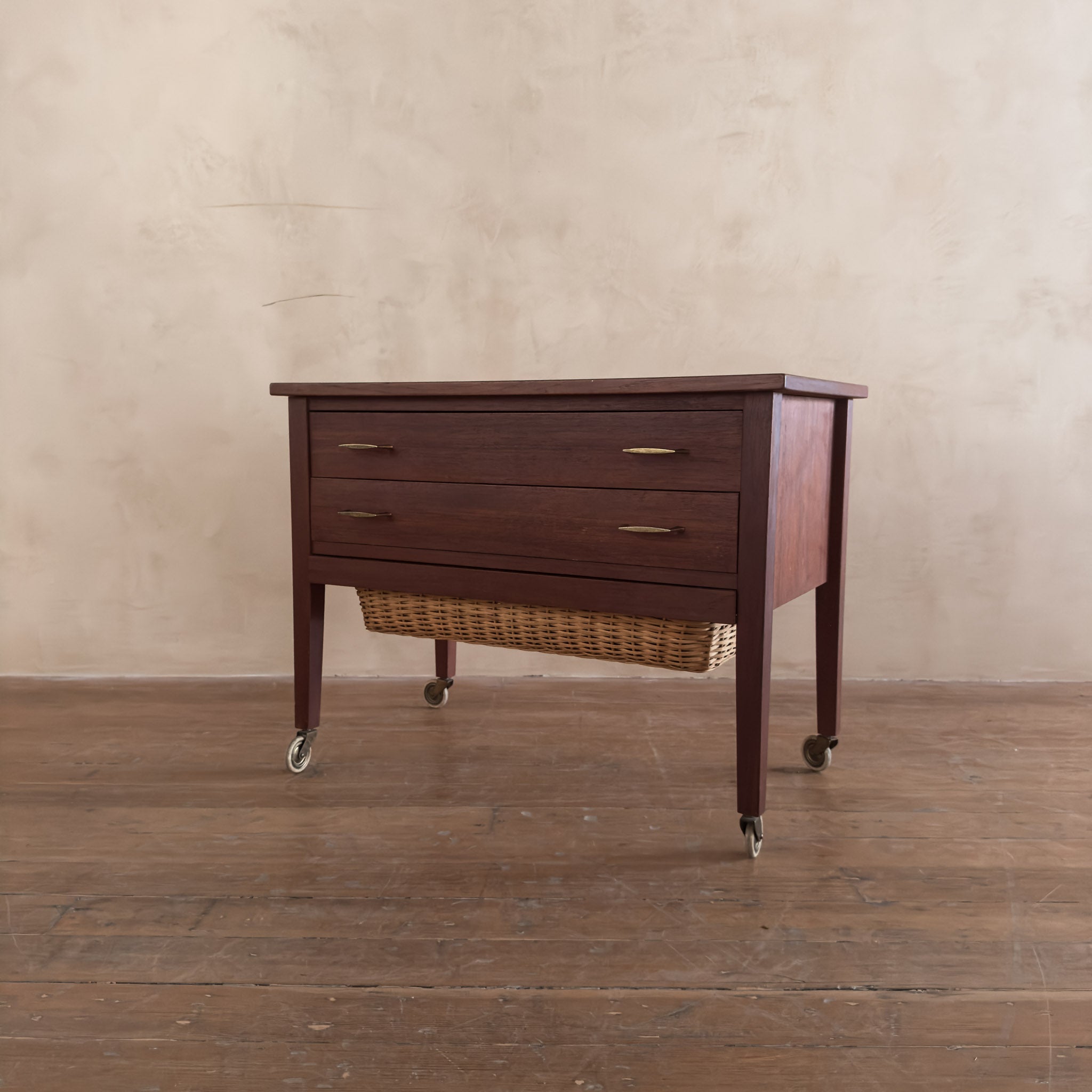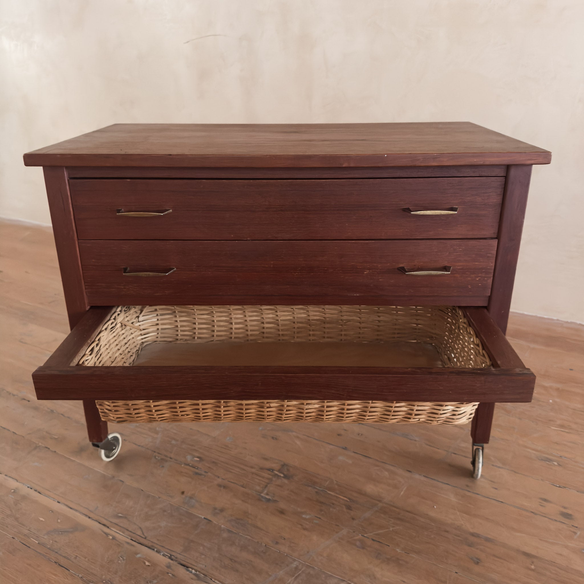 This piece is available for presale. Estimated arrival is February 20th. Teak storage chest featuring two standard drawers above a deep pull out basket drawer framed in wood. The woven basket adds a tactile layer to the clean, midcentury lines of the piece.