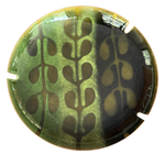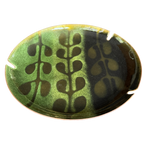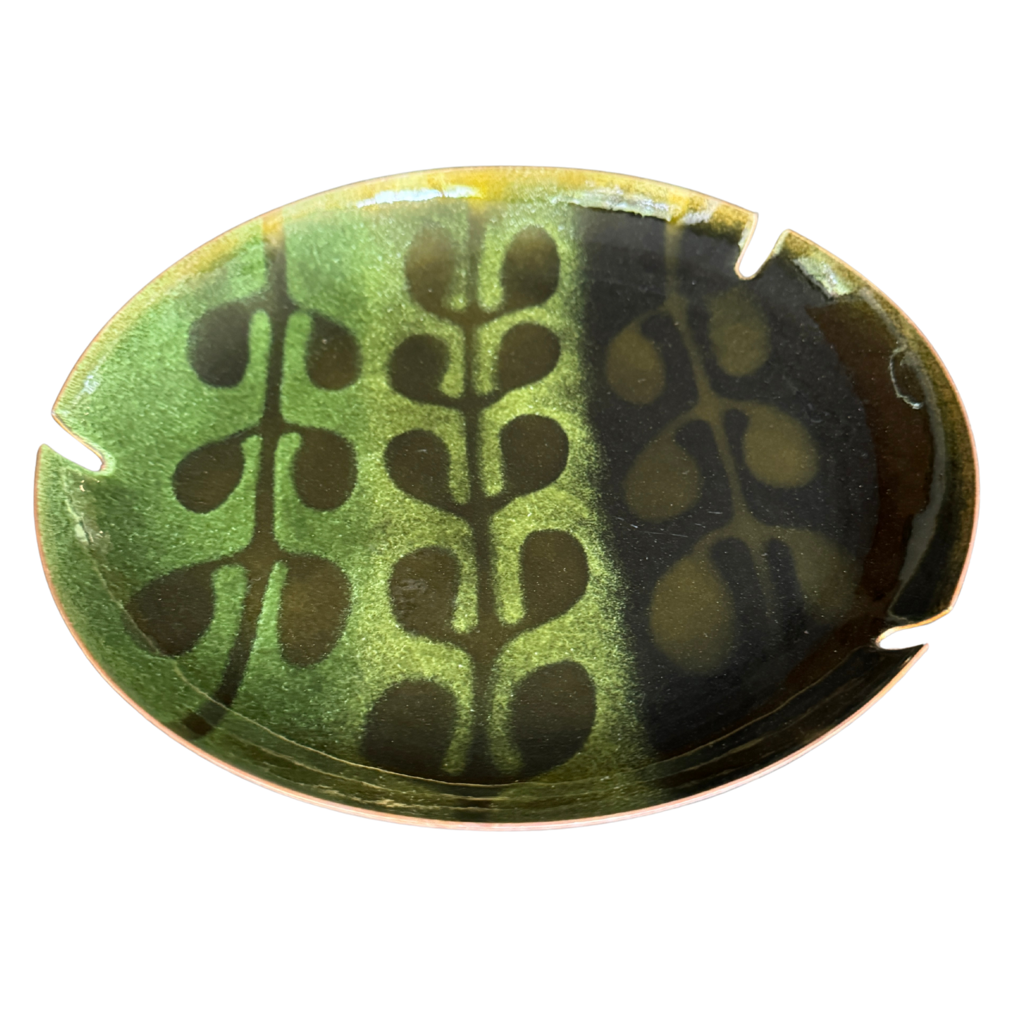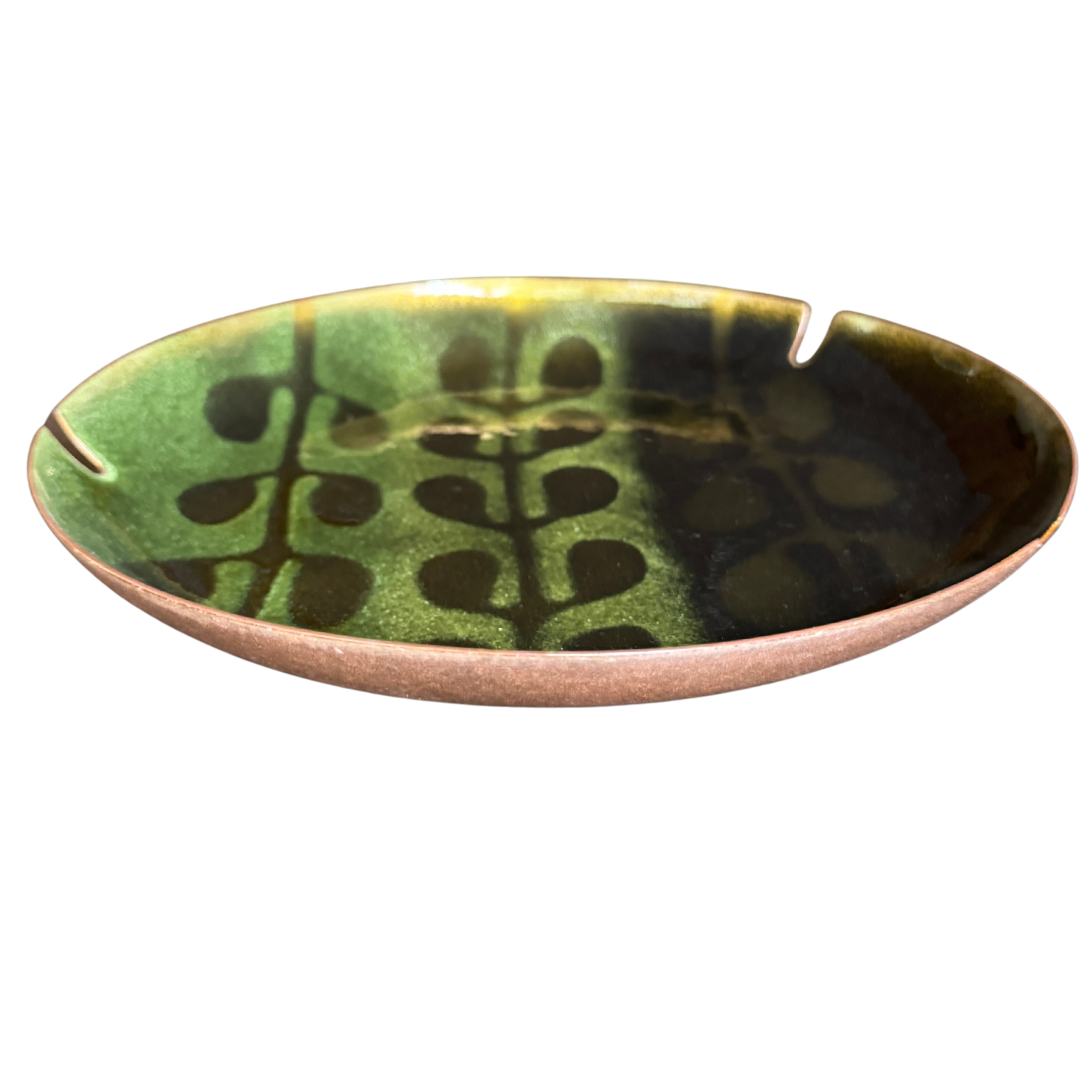 Shallow lacquered metal catchall with a green leaf motif, cut rim rests, and a copper metal underside.