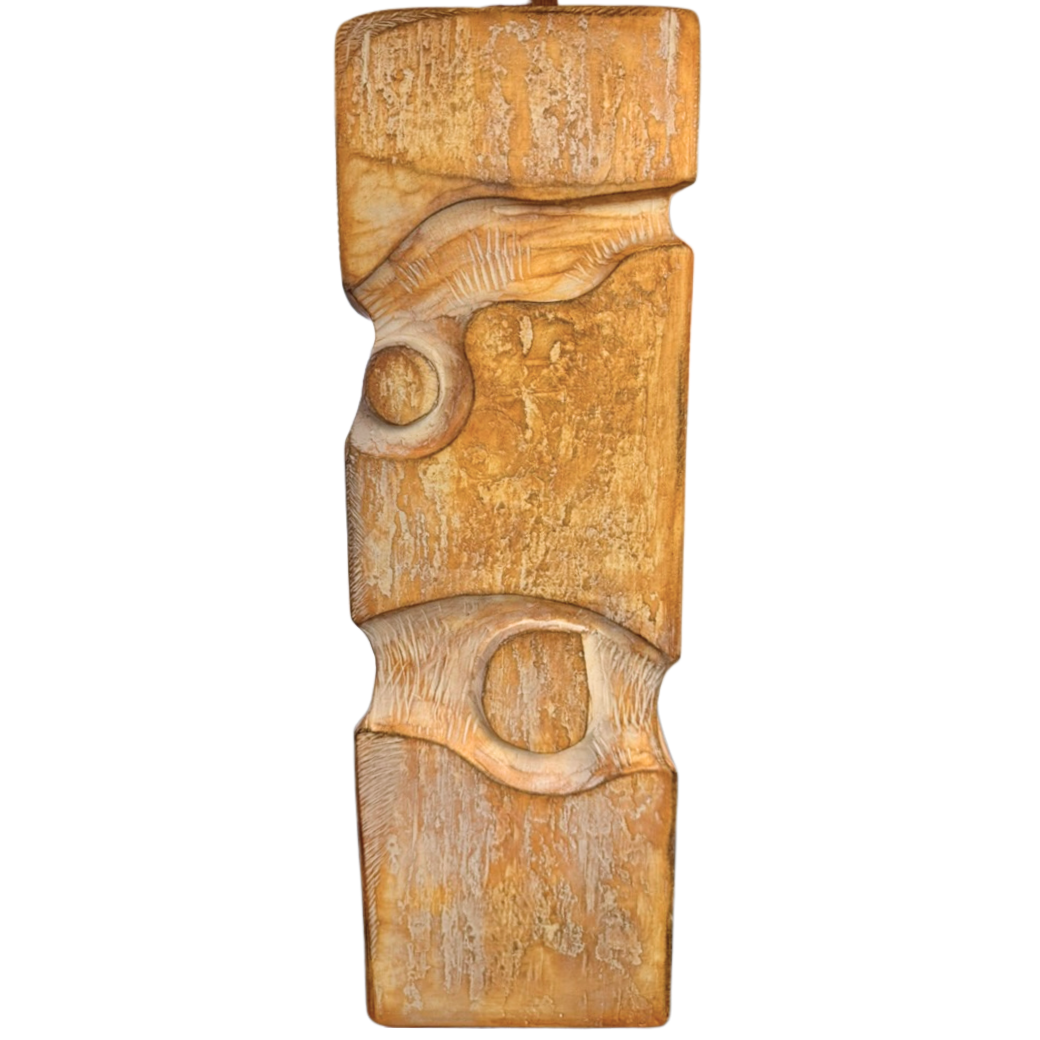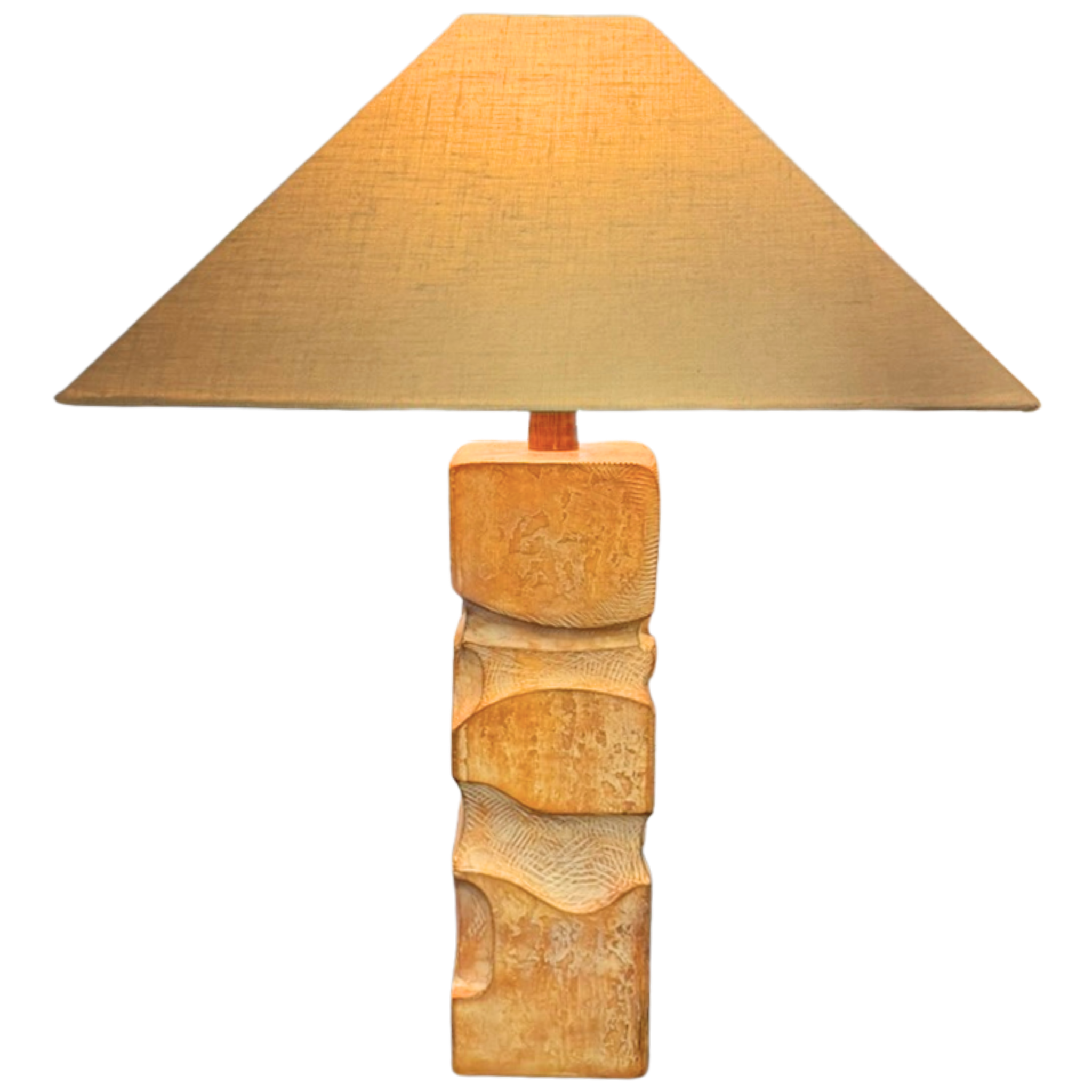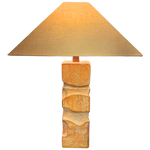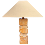 Ceramic table lamp with a stacked, block form and carved relief detailing. Matte earth toned glaze with beautiful texture across the surface. The base is signed at the corner, paired with a tapered, squared linen shade.