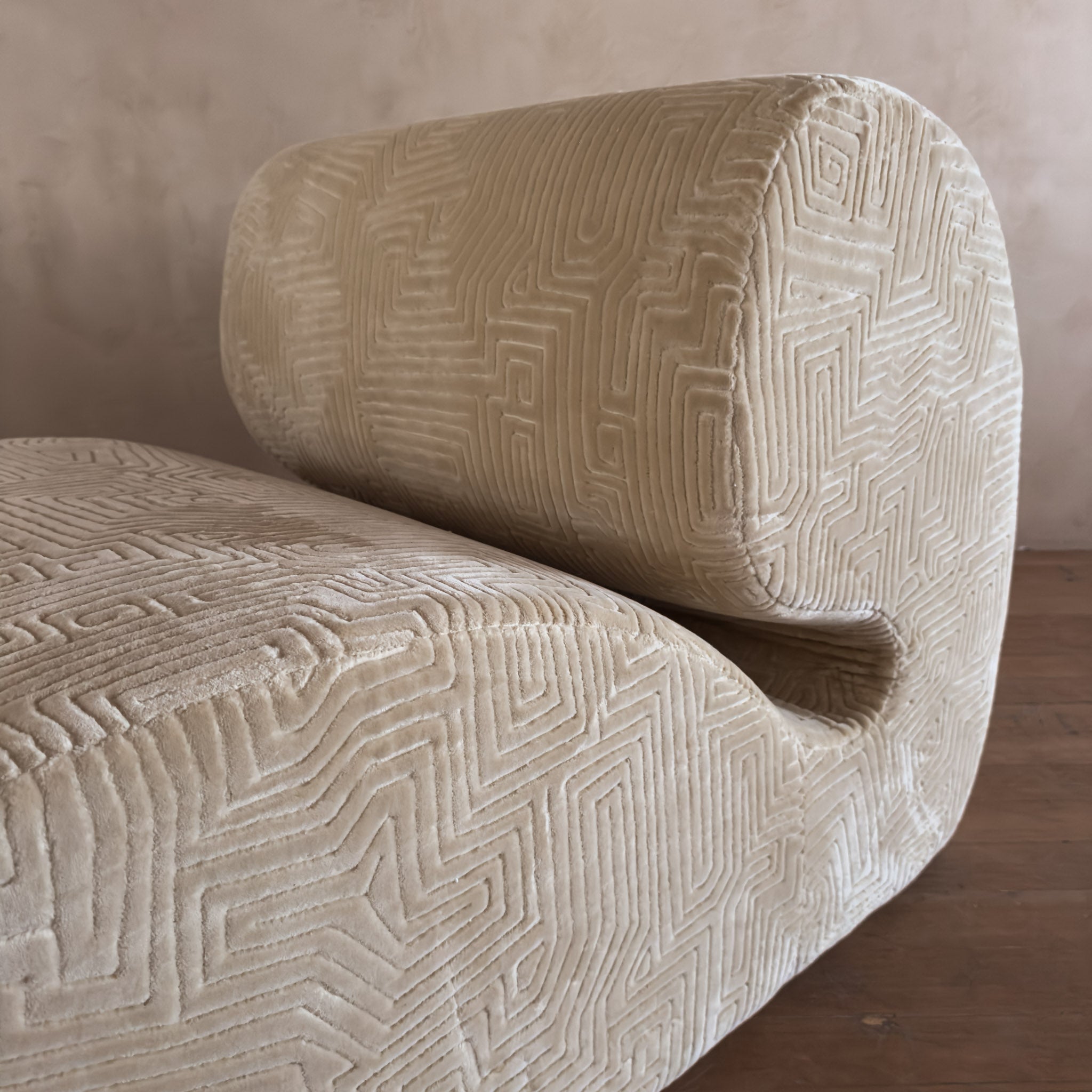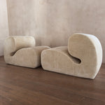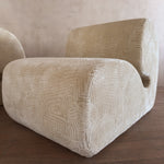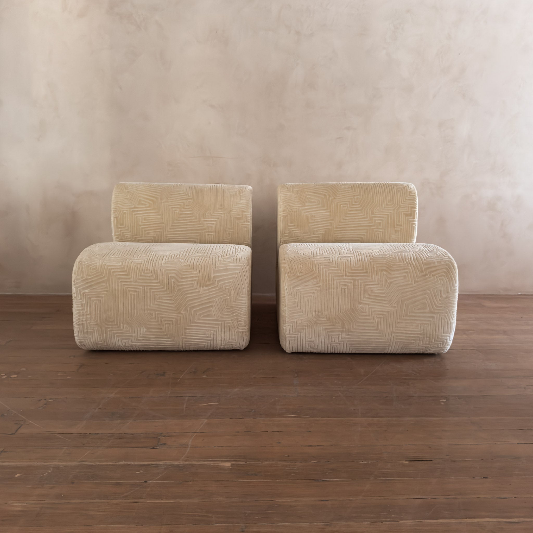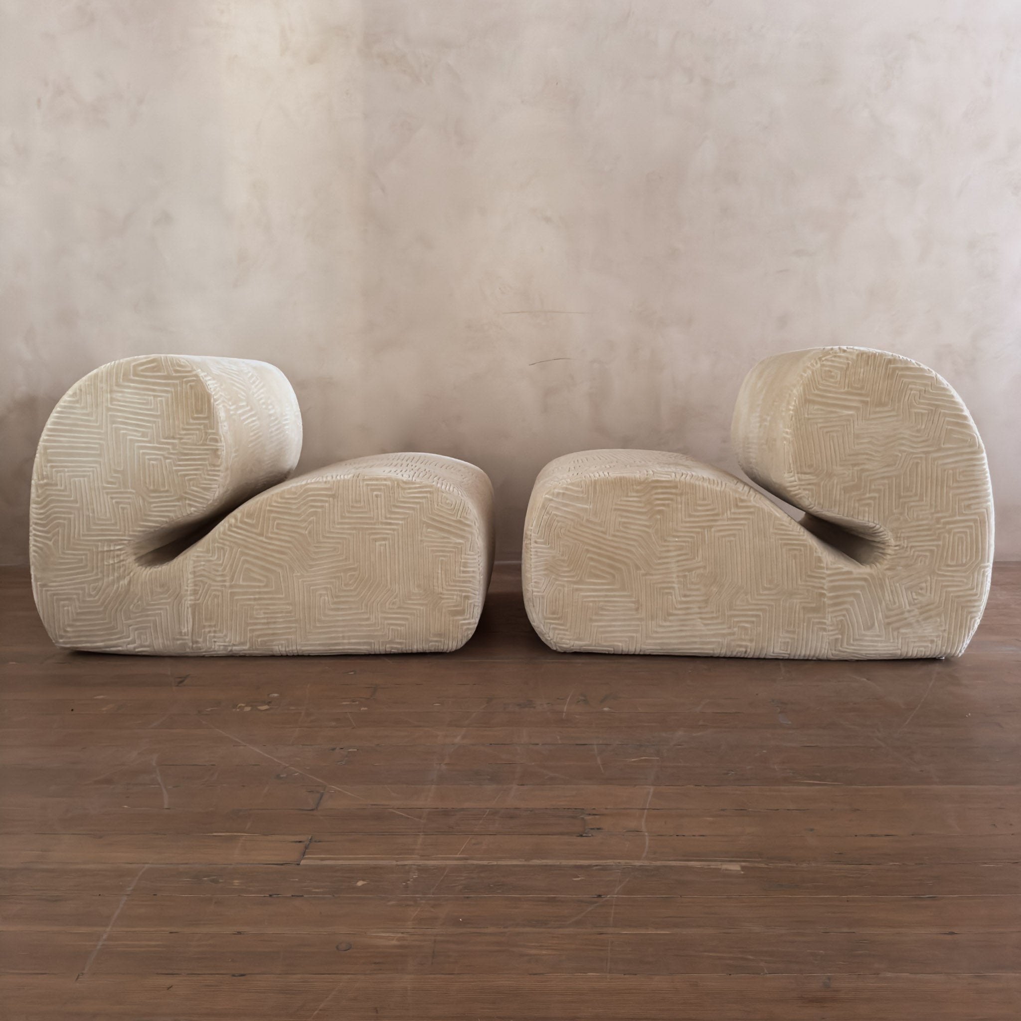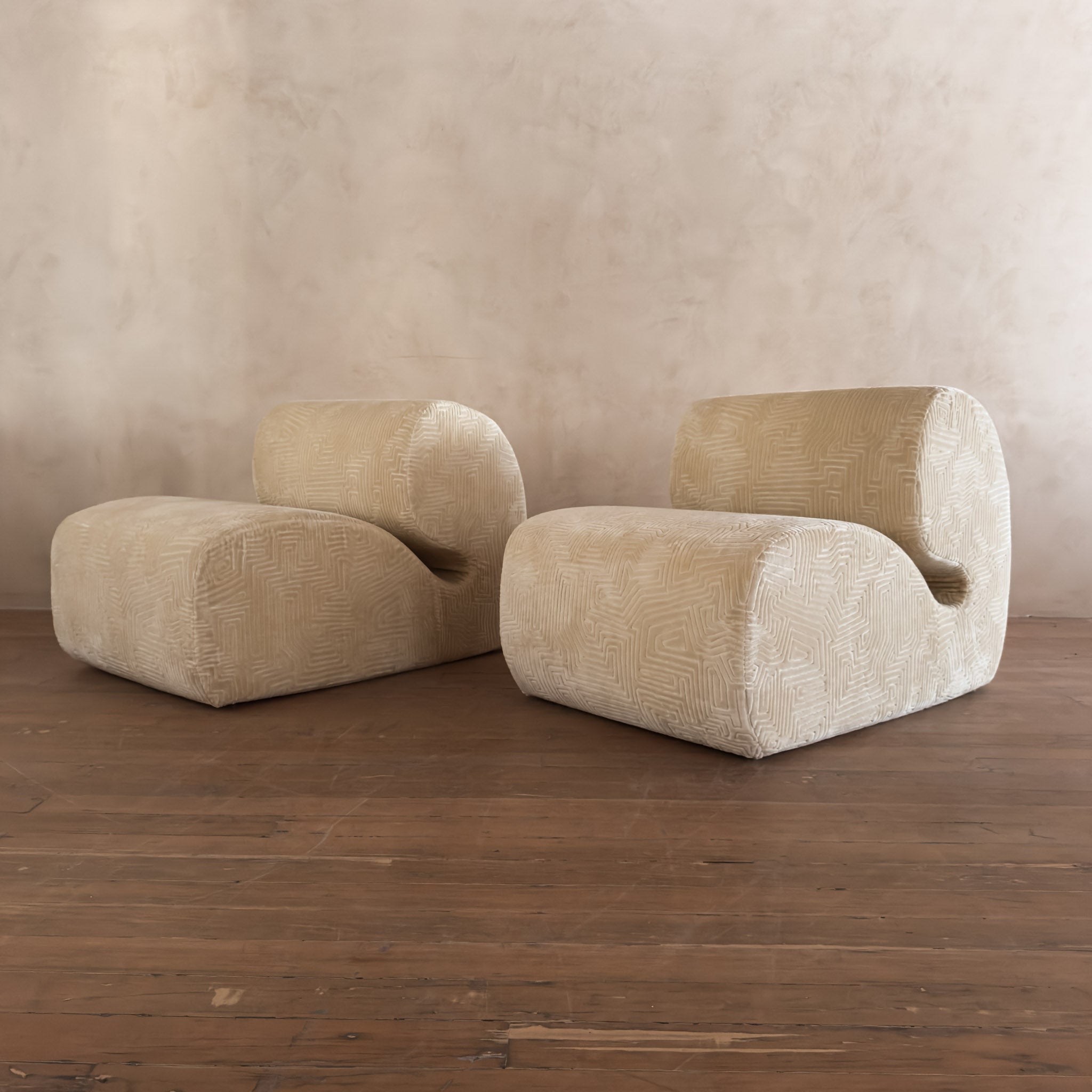 Postmodern pair with soft geometric profiles and a low, sculptural sit. The cream upholstery has a raised geometric pattern that adds a layer of dimension to the rounded frames.