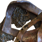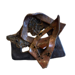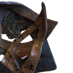 Layered ceramic wall piece with intersecting shapes and cutouts. Combines smooth and rough textures with a mix of matte and glazed finishes in tones of dark brown, rust, and charcoal.