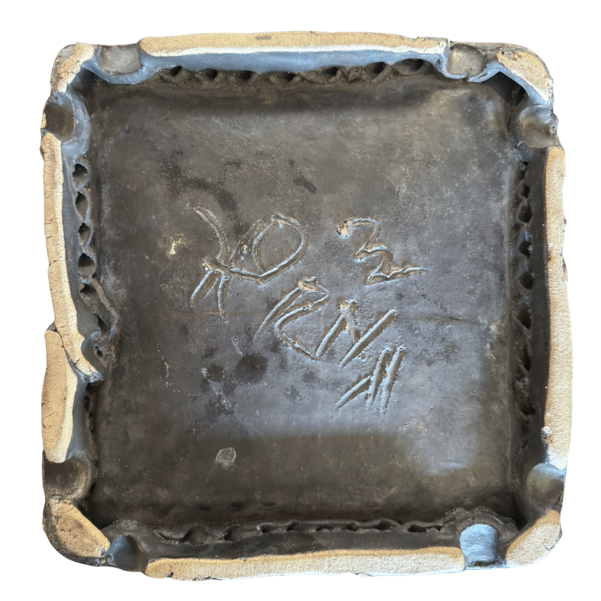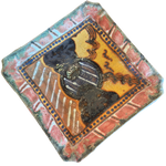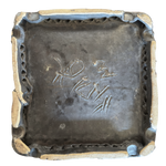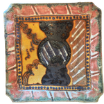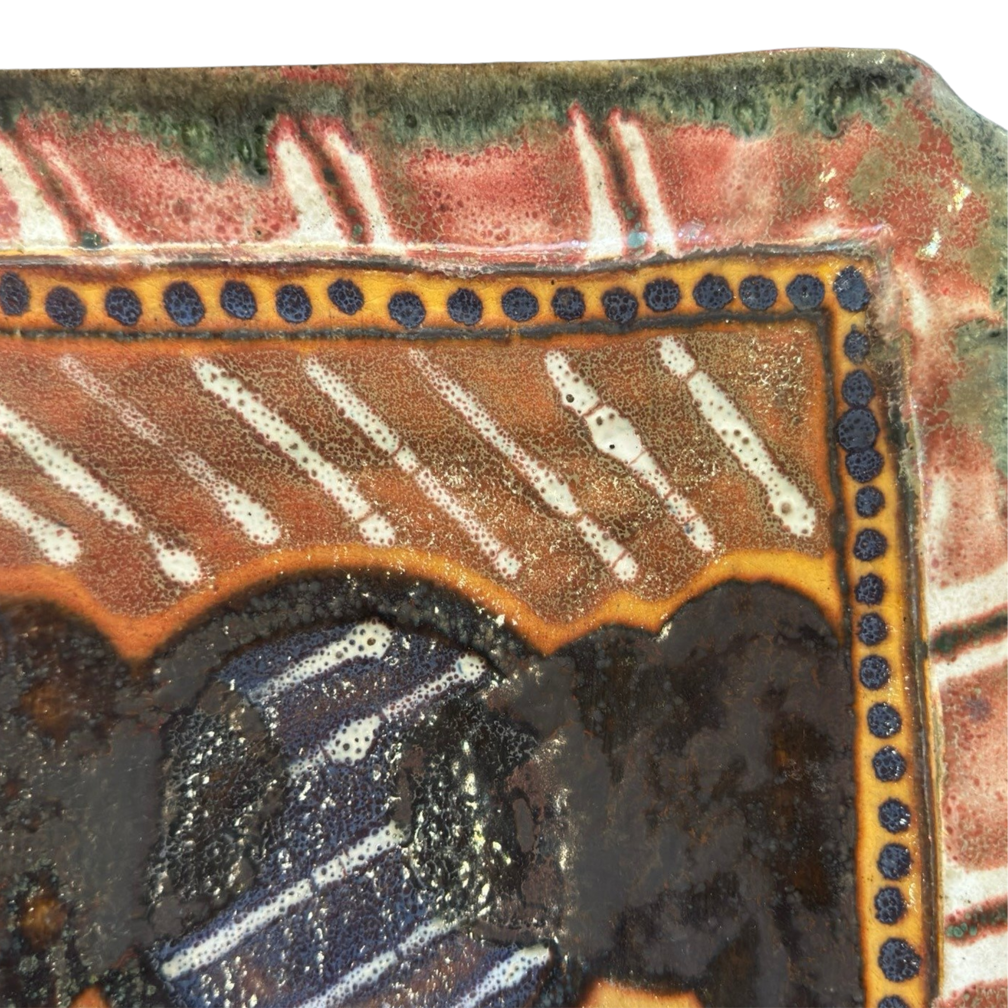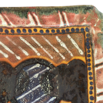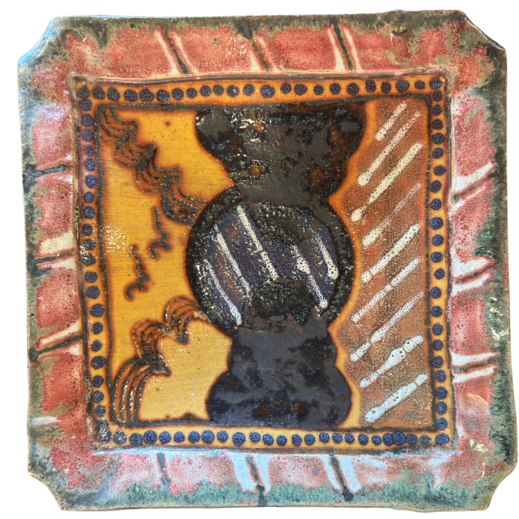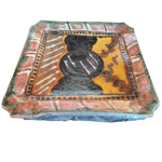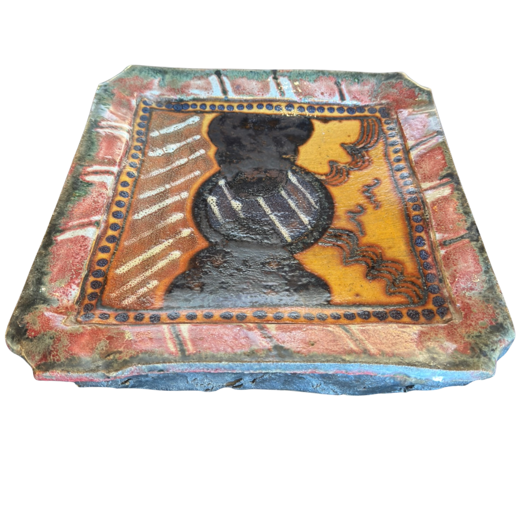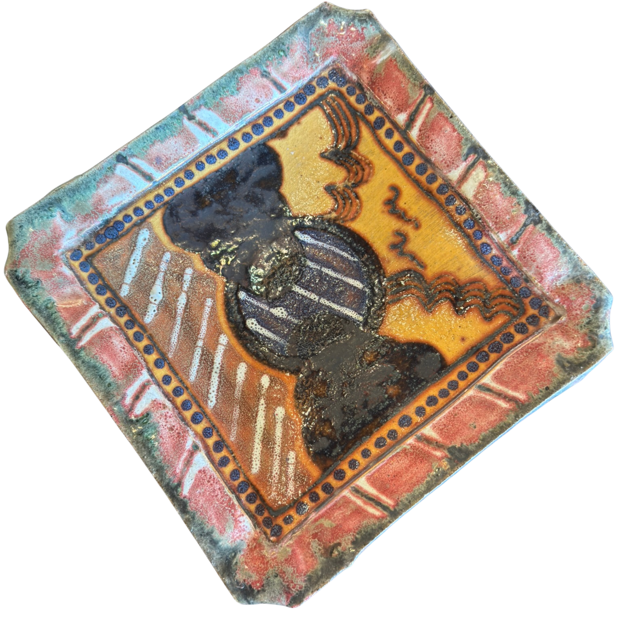 Square ceramic tray with a raised rim, decorated in layered glazes of earthy red, mustard, green, and deep blue. The abstract central motif is framed by a dotted border, with varied textures and an iridescent finish adding depth to the surface.