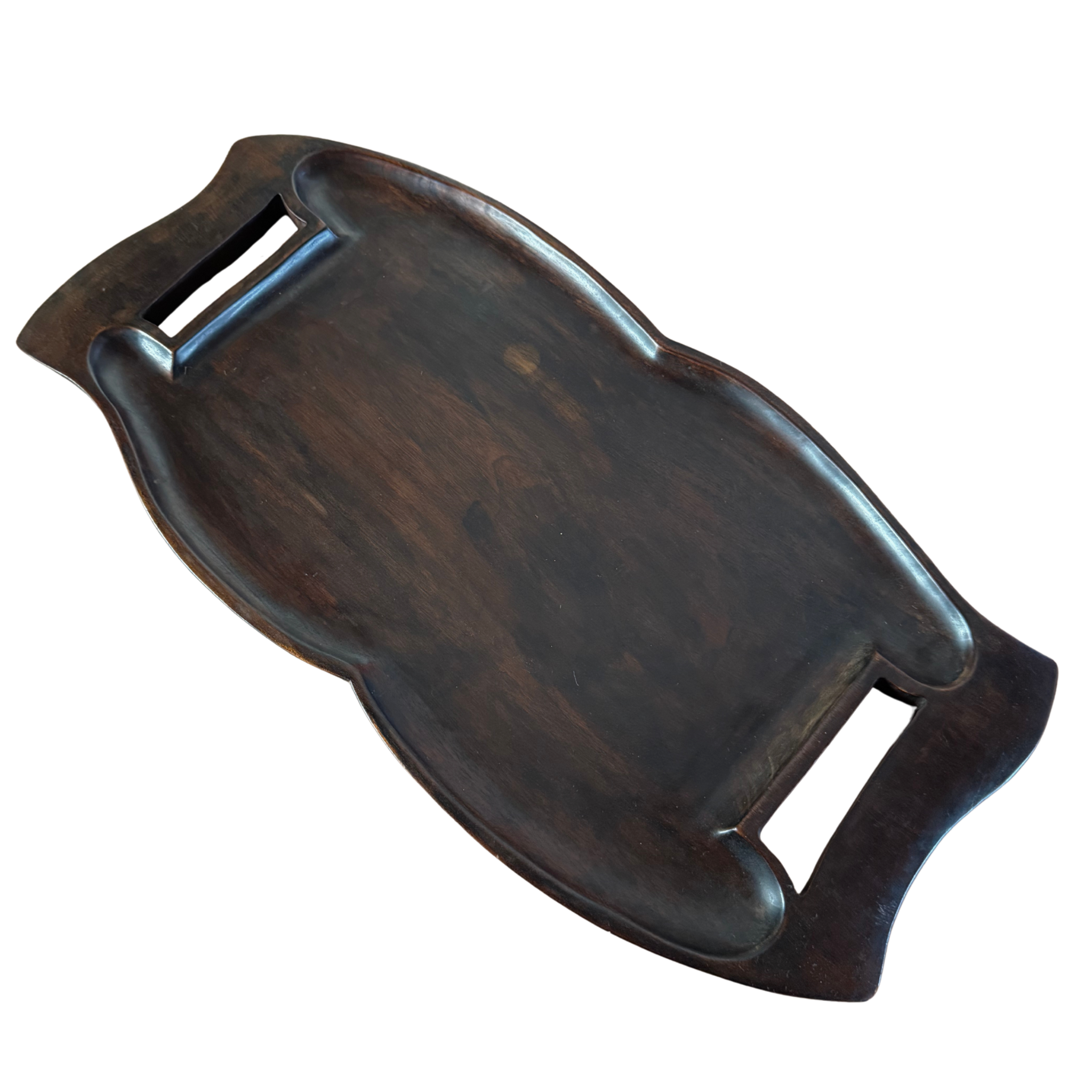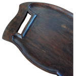 Carved from richly grained mahogany, this sculptural tray features soft contours and integrated handholds at each end. The surface shows a warm patina, highlighting subtle variations in tone and texture.