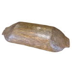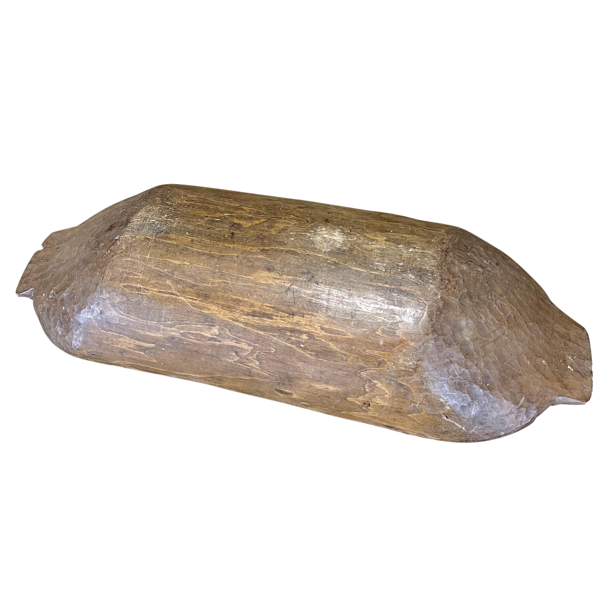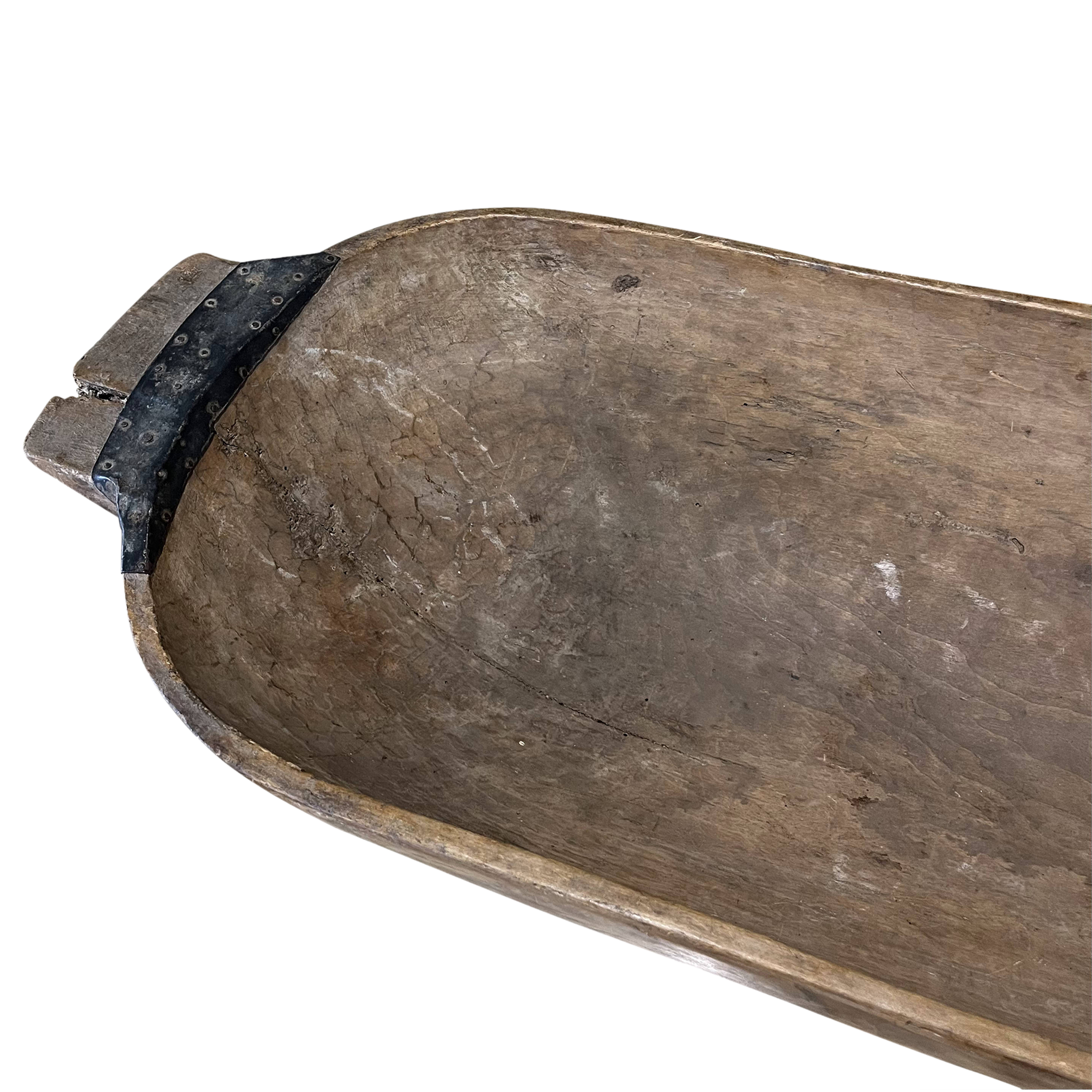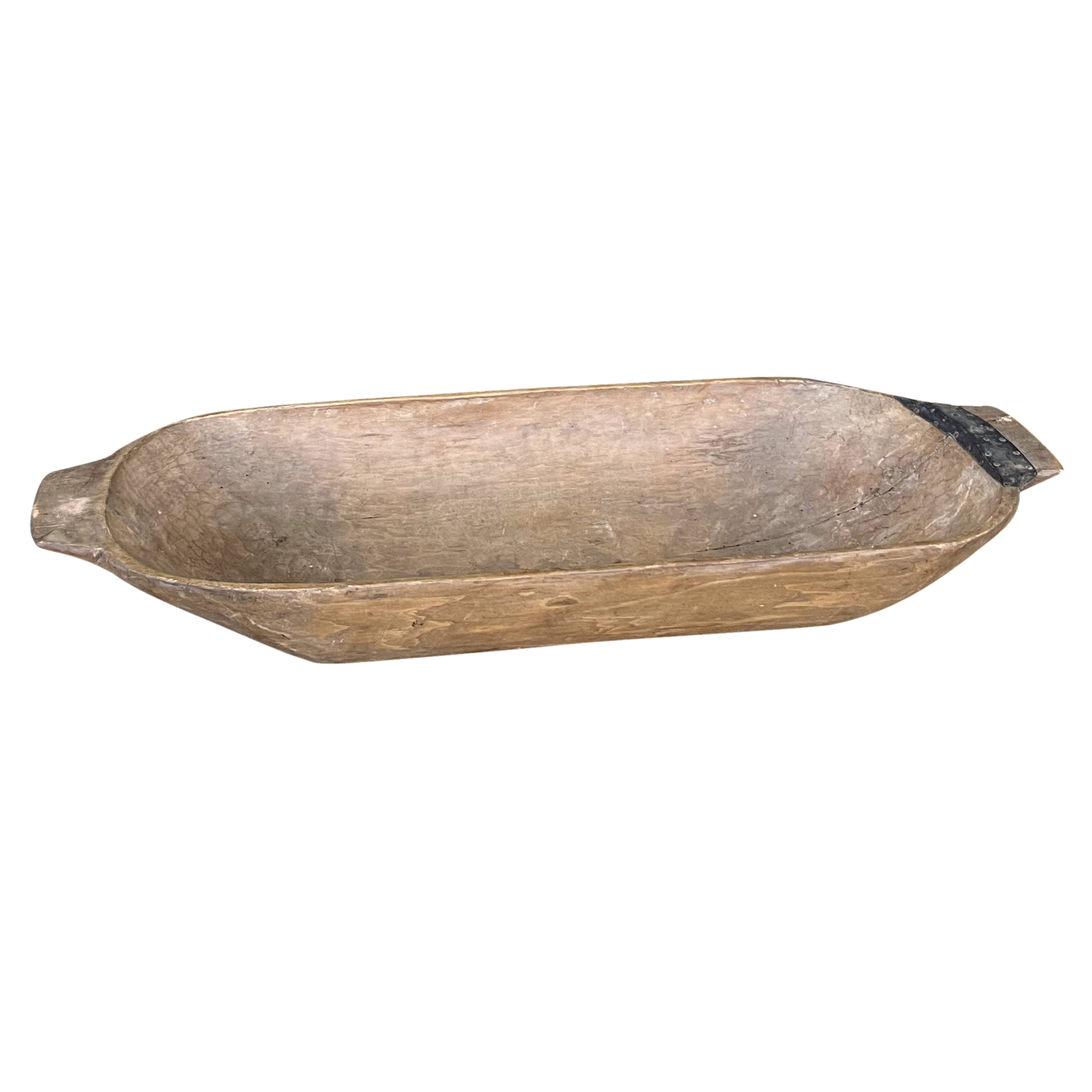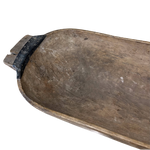 An antique wooden dough trough with a rich, weathered patina. Its deep, elongated shape and natural wear highlight its history and functionality.