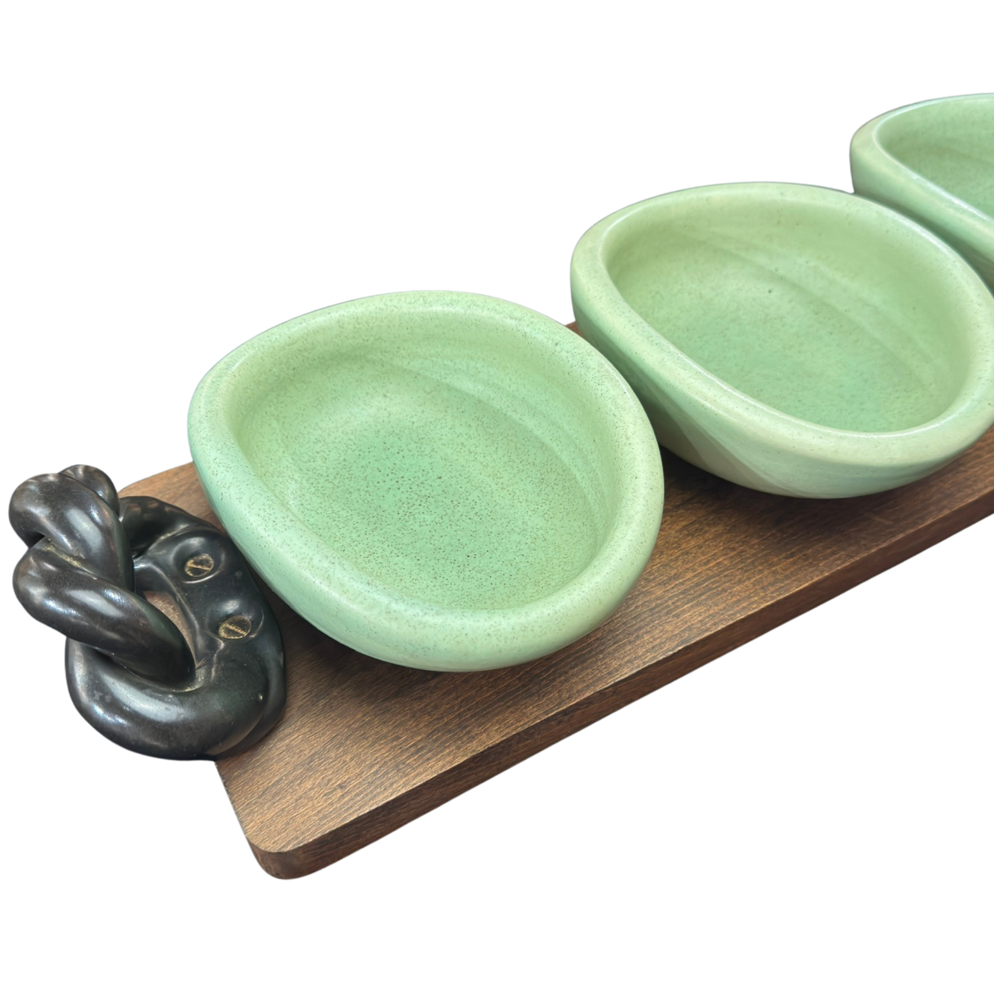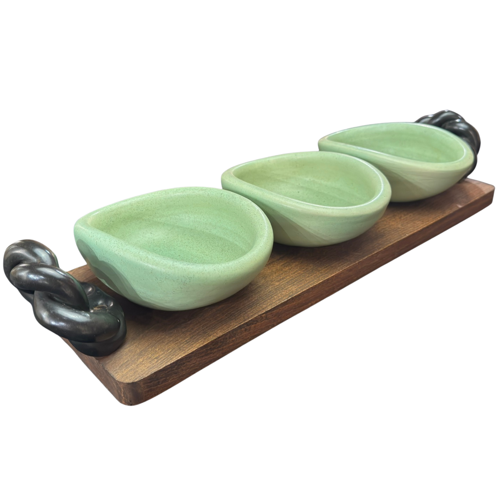 Three celadon bowls with smooth sculpted interiors set into a walnut tray with twisted ceramic pulls. The pale green glaze has a soft mineral cast that plays well against the darker wood.