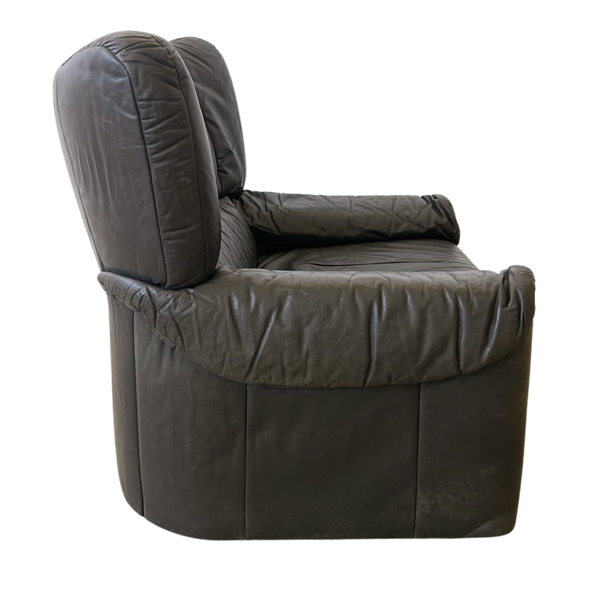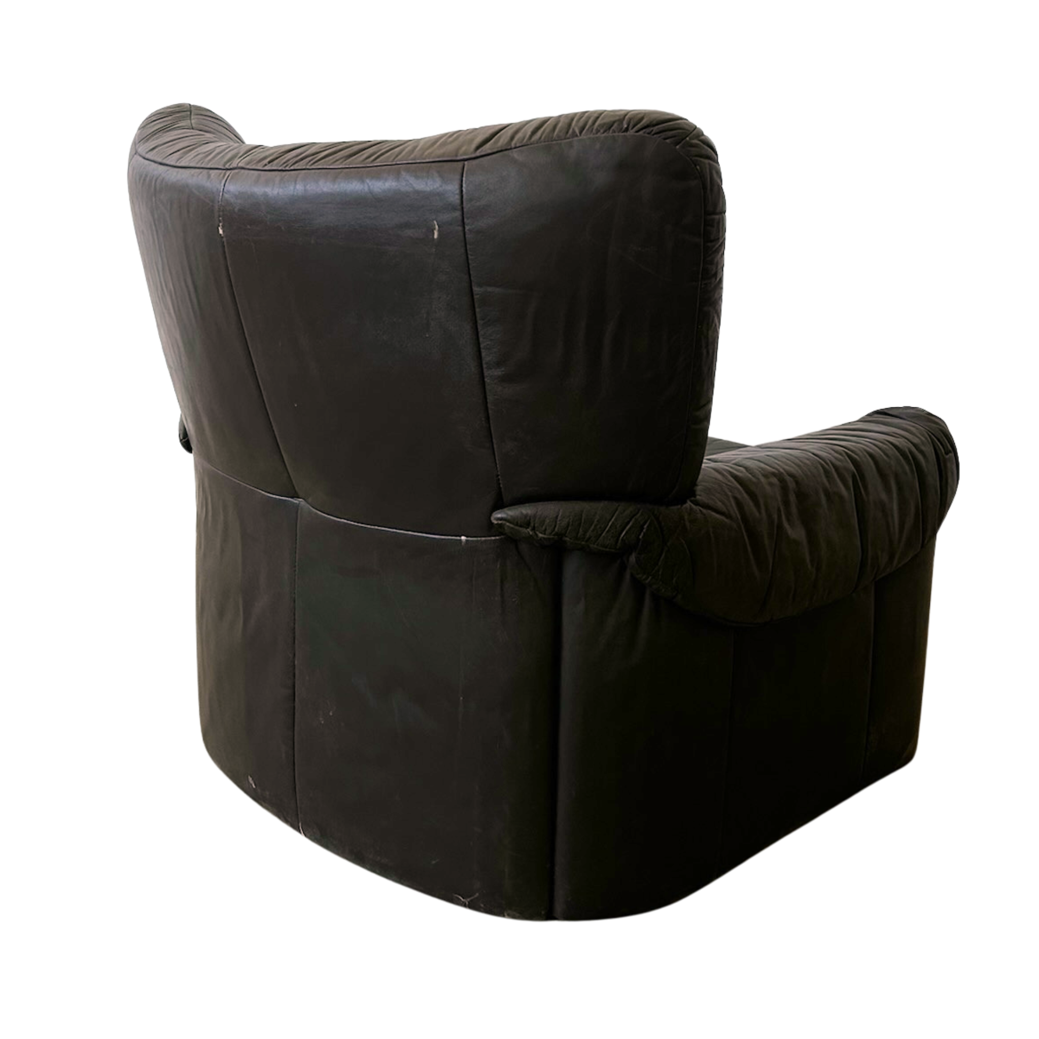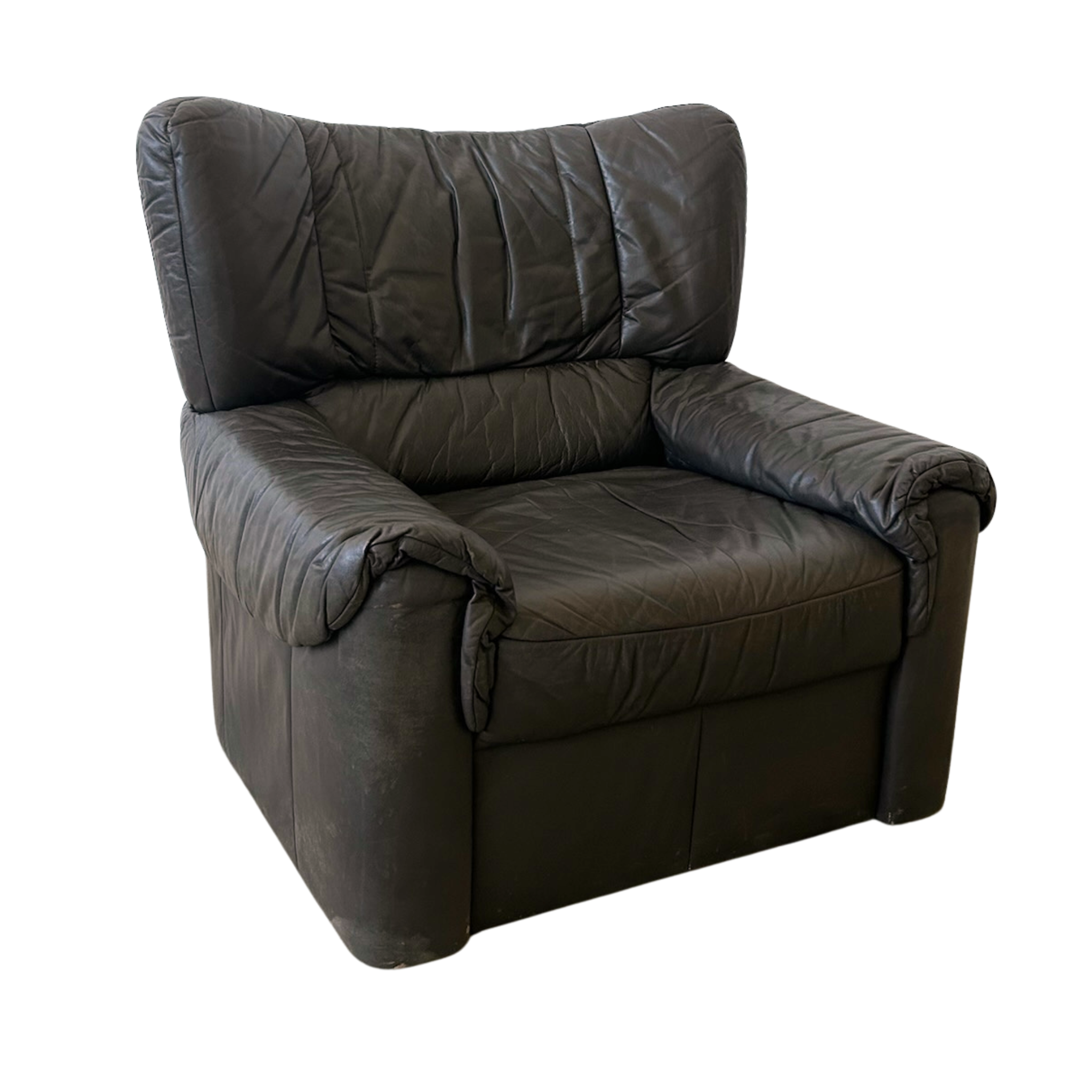 SALE- marked down from $3,950. Matching sofa available, sold separatey. High back leather chair in a deep espresso tone with a softly worn patina.