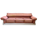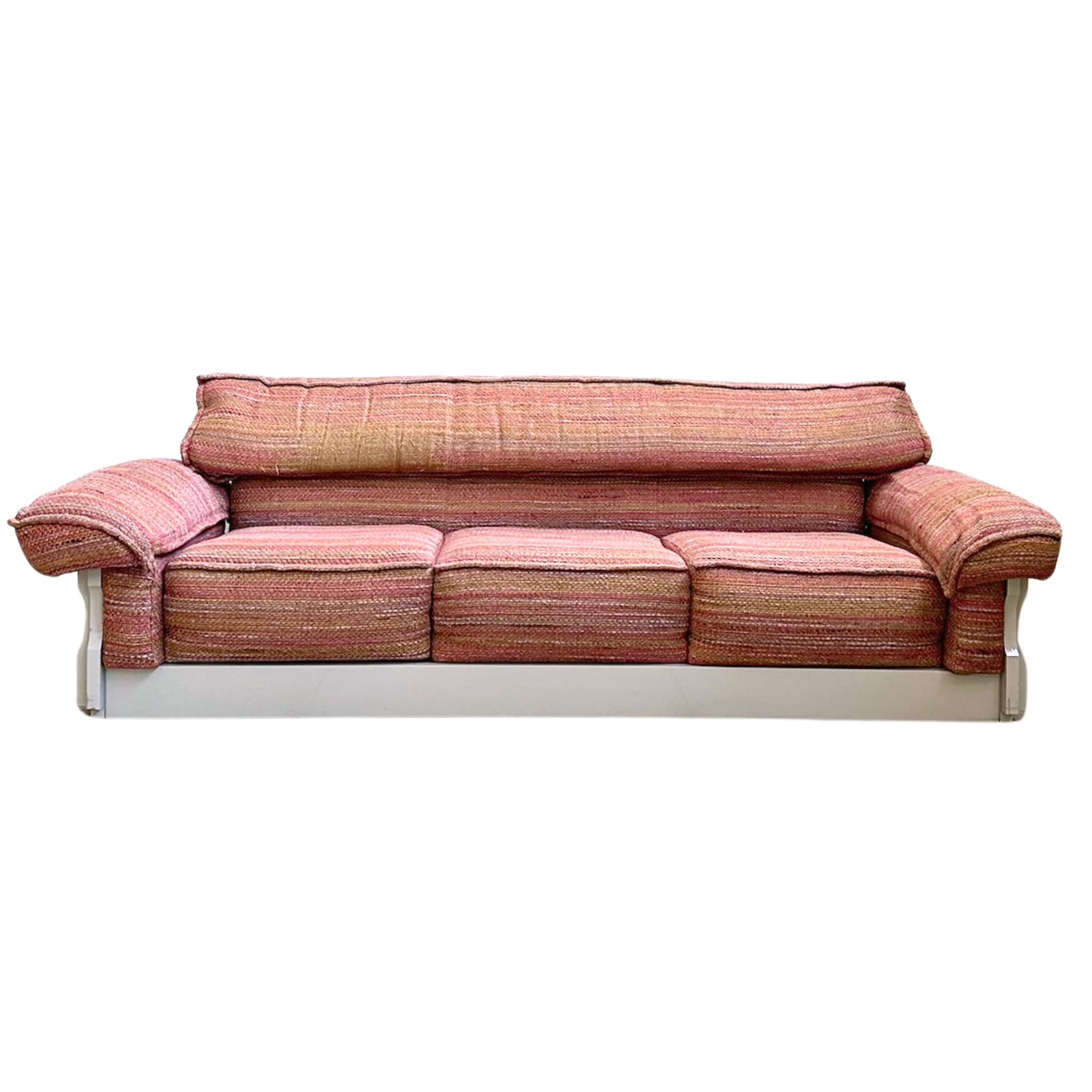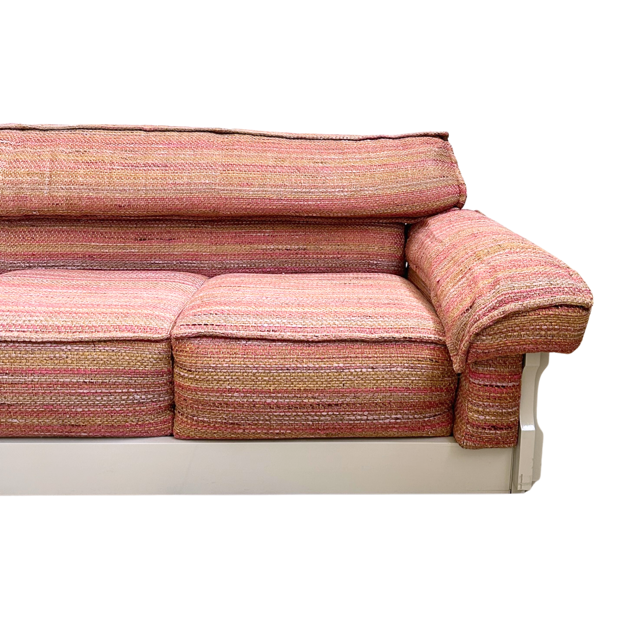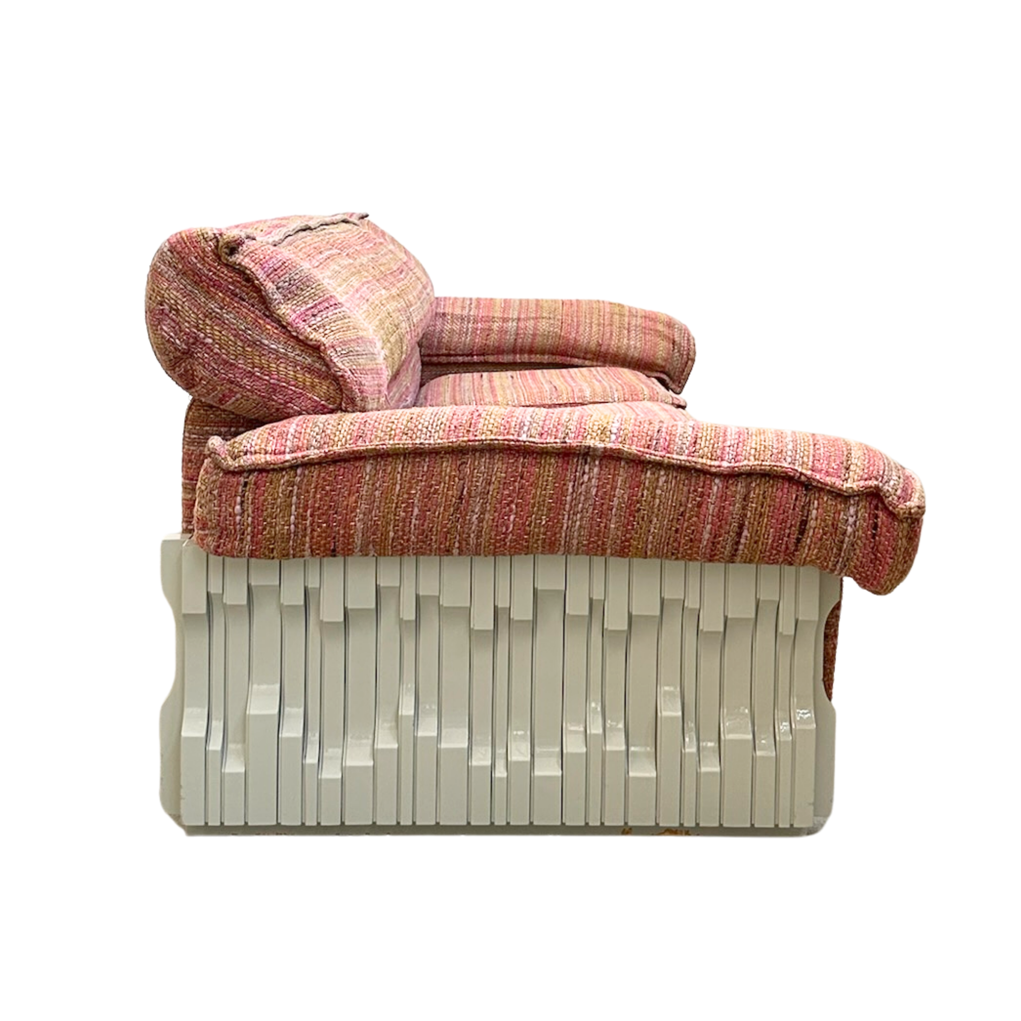 SALE- marked down from $7,200. Matching Loveseat available, sold separately. Custom designed by Luciano Frigerio in the 1970s for the Missoni family, the 'Norman' sofa is a rare example of Italian craft meeting fashion legacy. Sculpted white lacquered wood arms echo the architecture of his signature cabinetry. The original Missoni upholstery blends warm pinks and reds in a thick, textural weave. A collectible piece with unmistakable provenance.