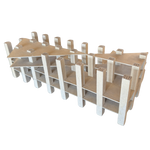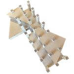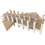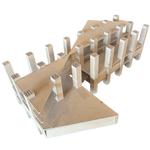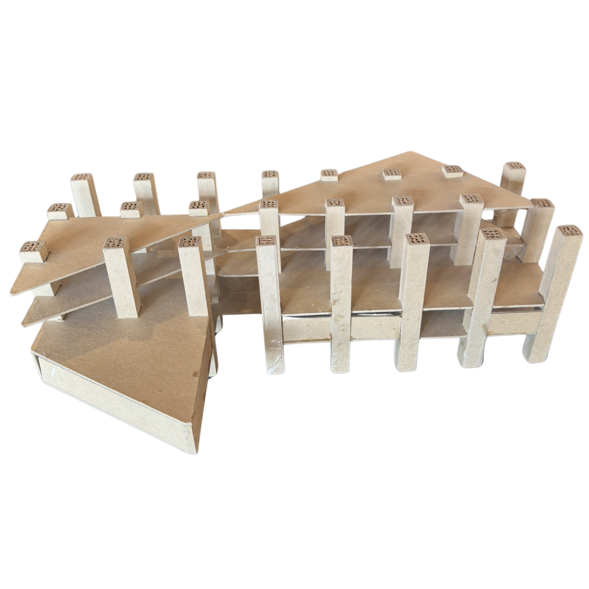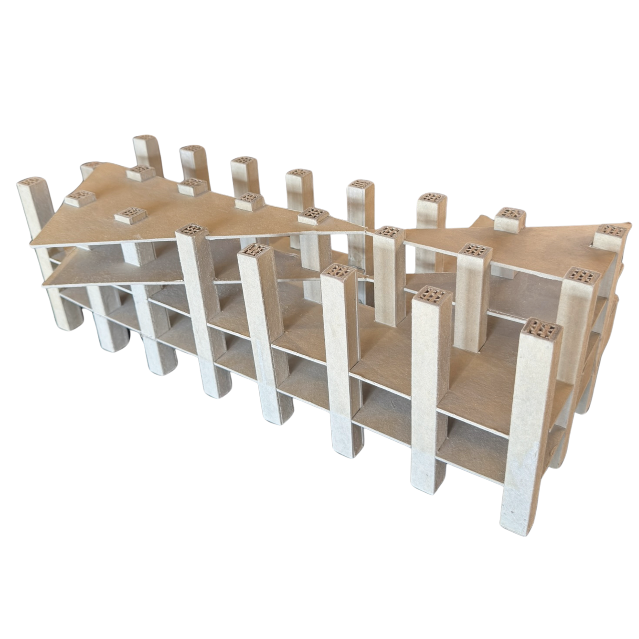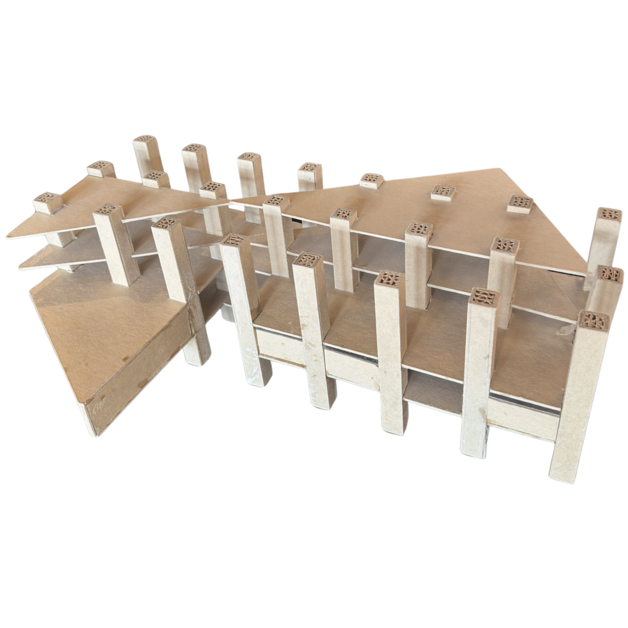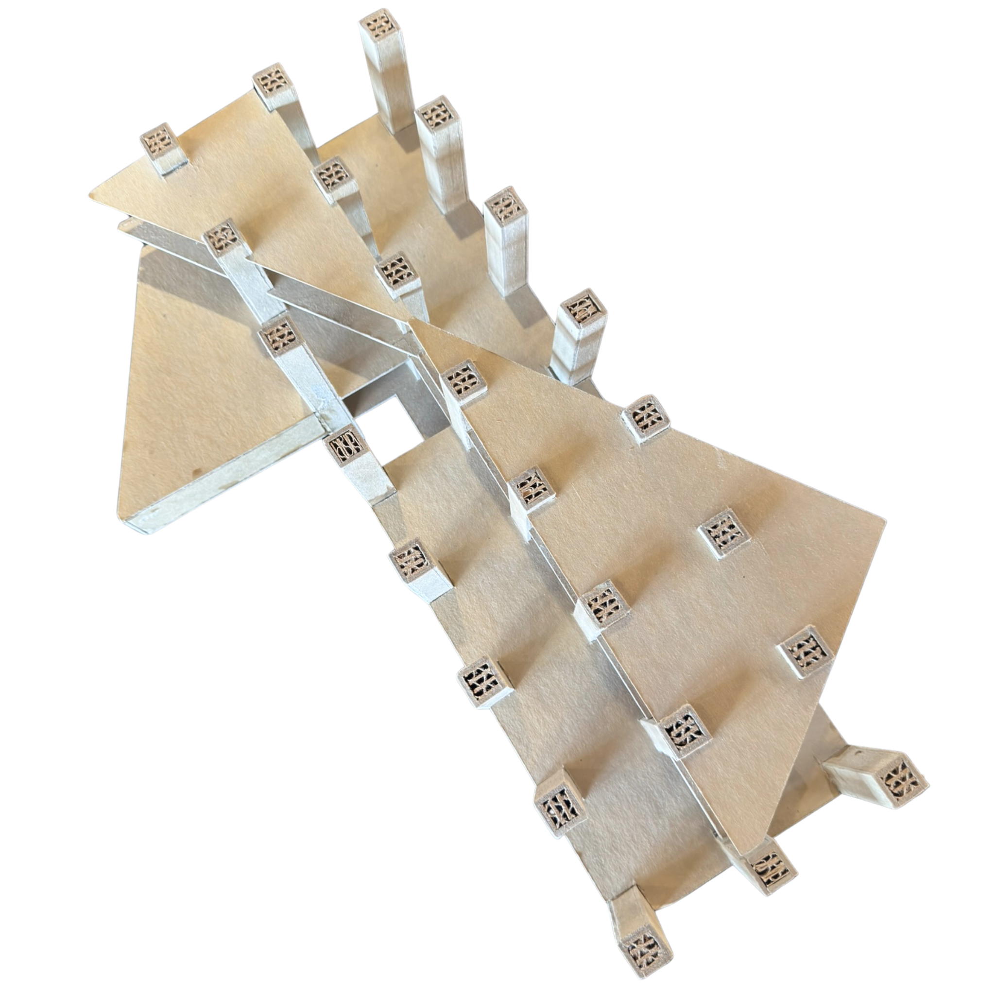 Small scale architectural model crafted from layered and folded paperboard. Featuring a geometric grid of vertical supports, this unusual piece has a sculptural presence when displayed as an object d'art.