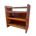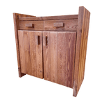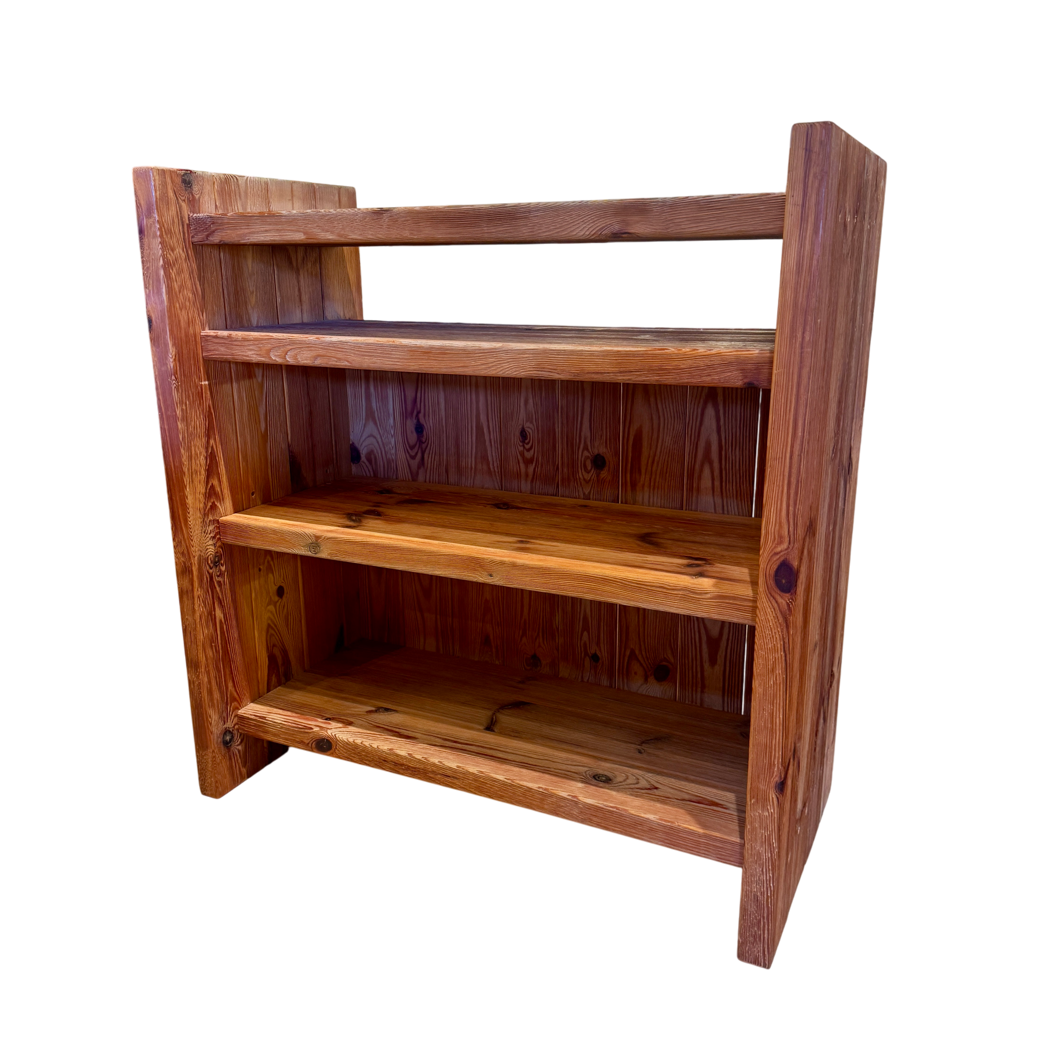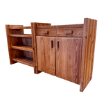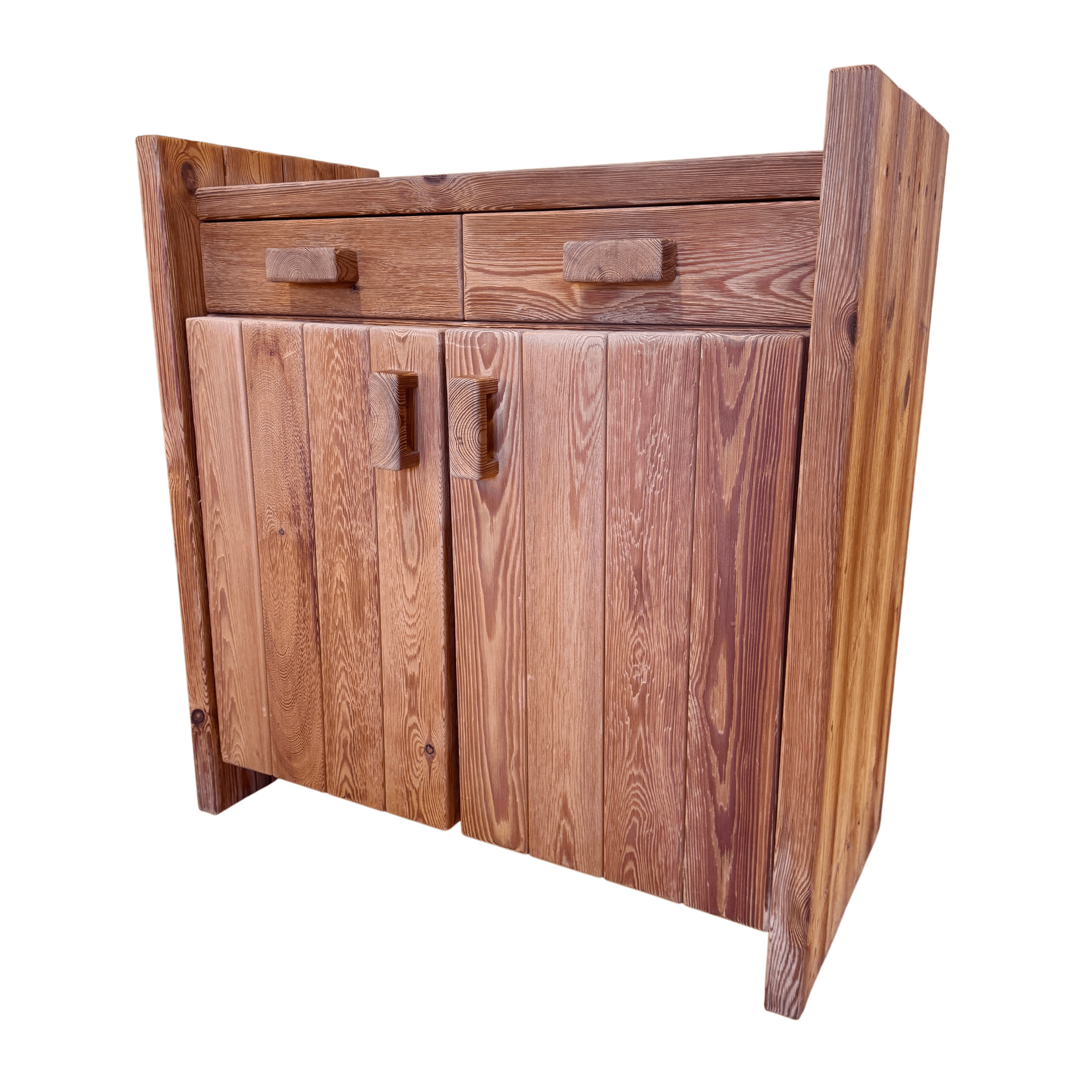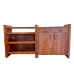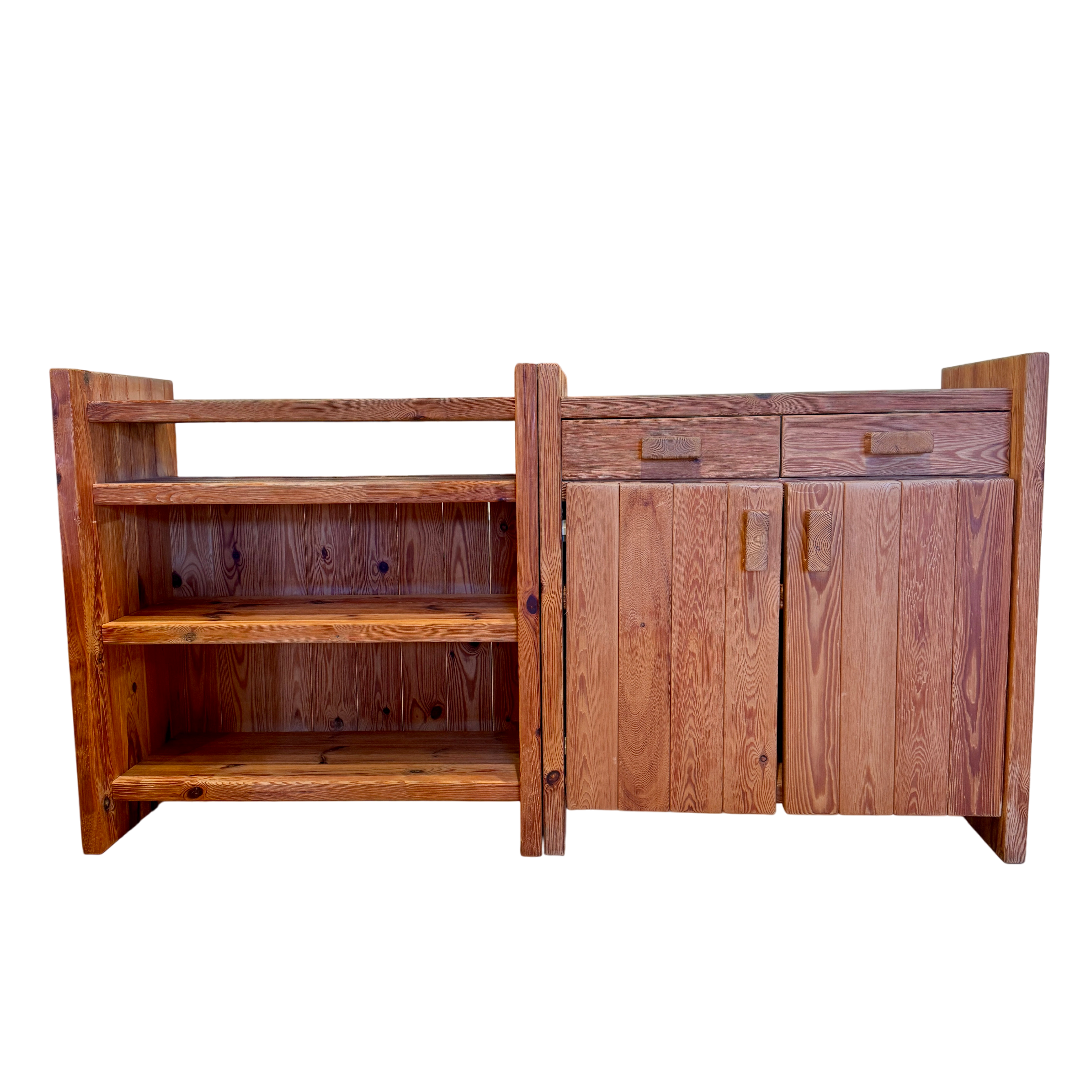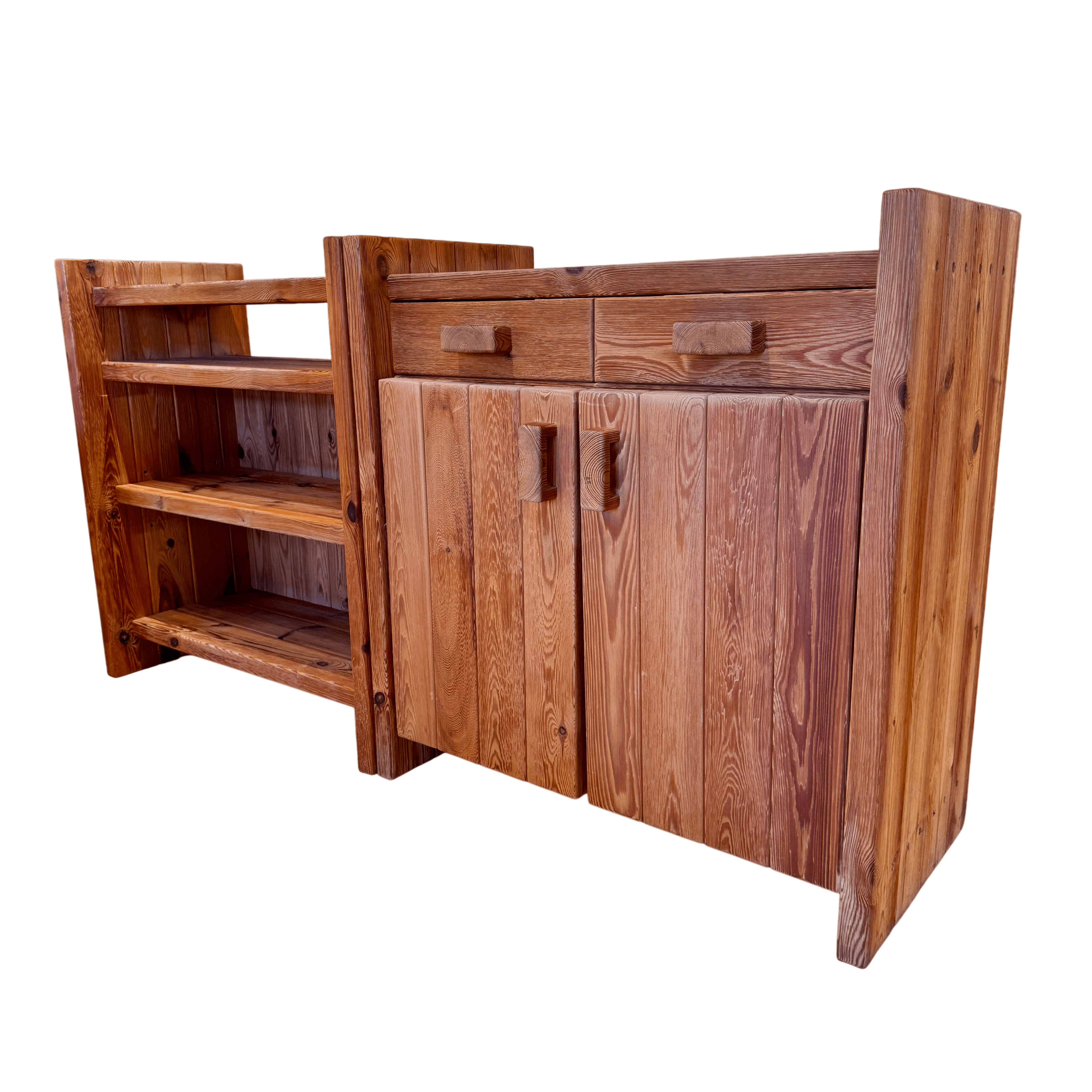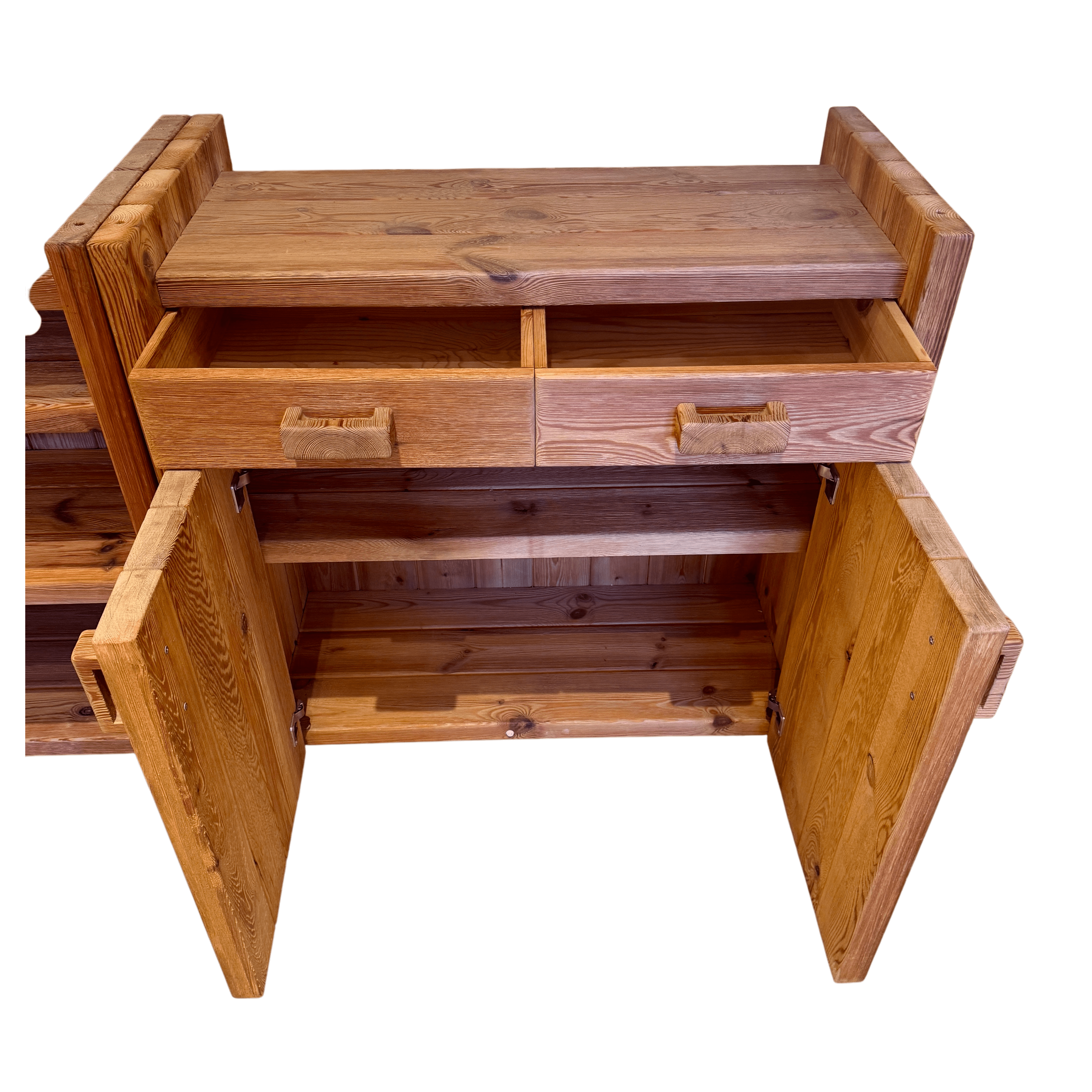 SALE- marked down from $2,850. Solid pine with a timeworn patina gives this storage unit a rugged, organic charm. The two piece construction adds versatility, while the natural grain and knots in the wood lend warmth and character.