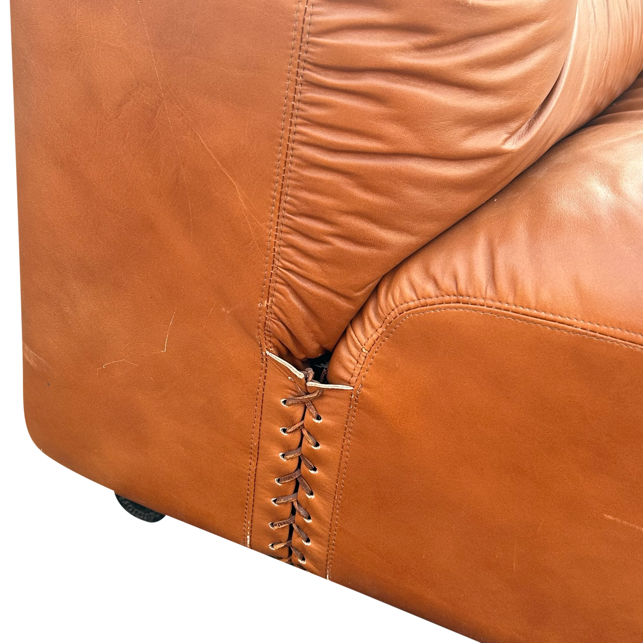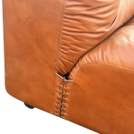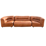 This piece is available for presale. Estimated arrival is mid to late January. Three piece modular sectional in cognac leather with deep channeling across the back and arms. The set includes a long sofa and two lounge chairs that can sit apart or link into a curve. Features unique stitching detail on each corner piece.