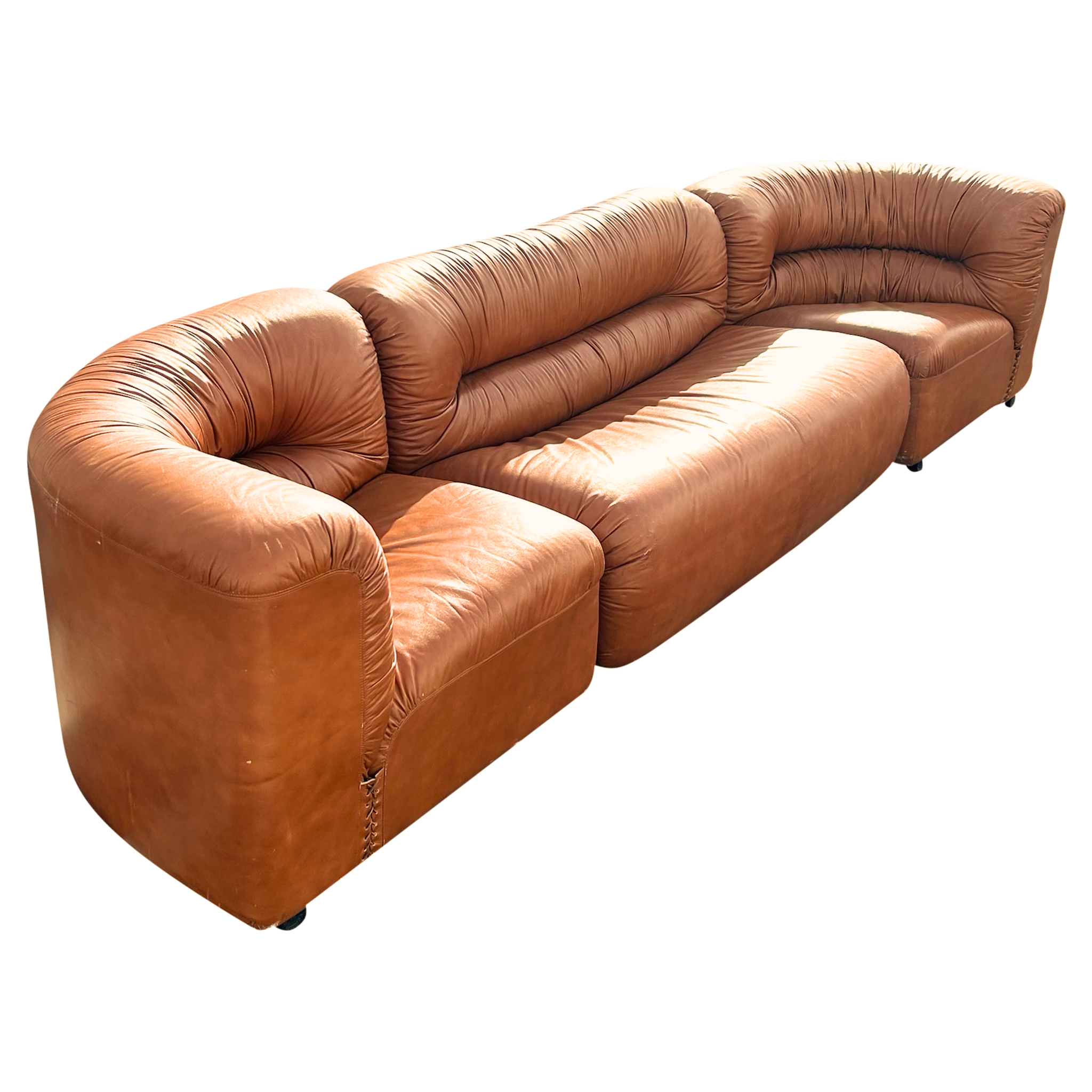 Cognac Leather Channel Back Curved Modular Sectional