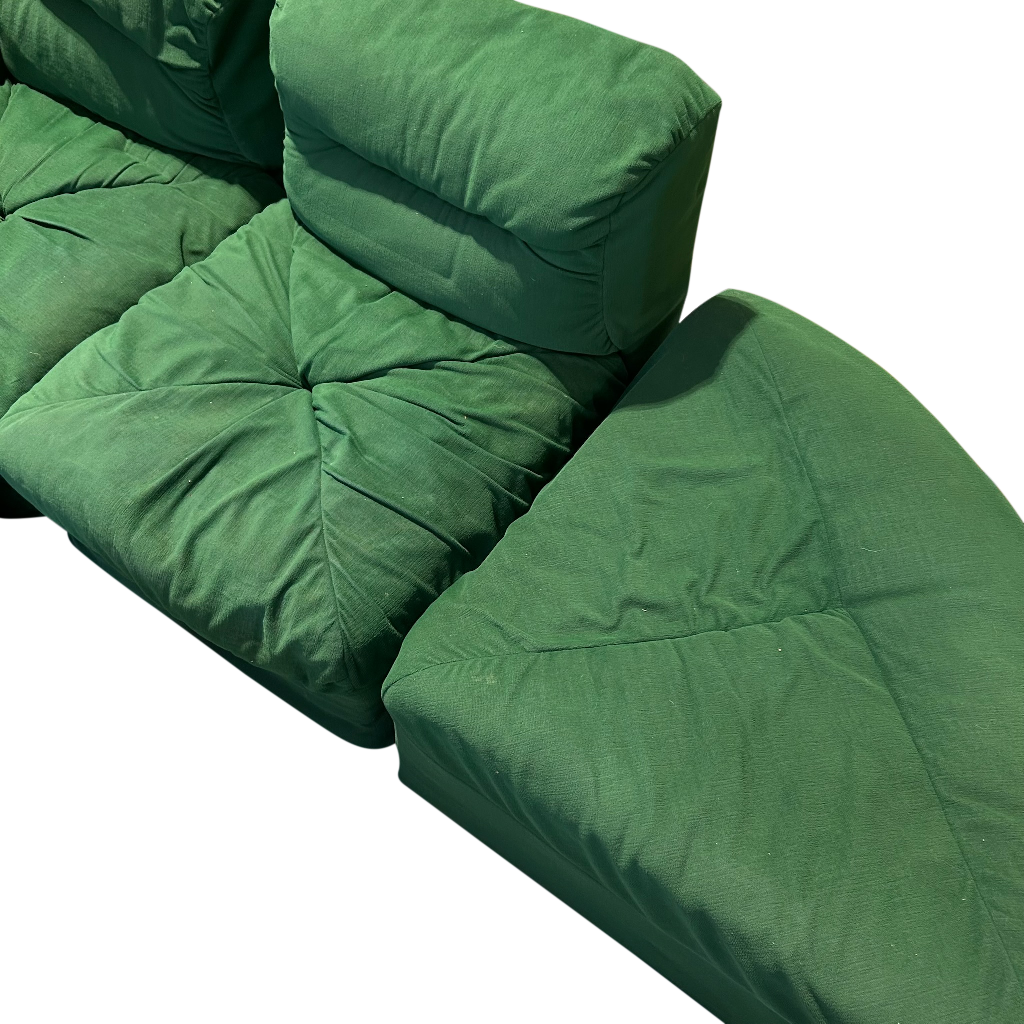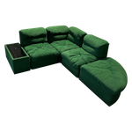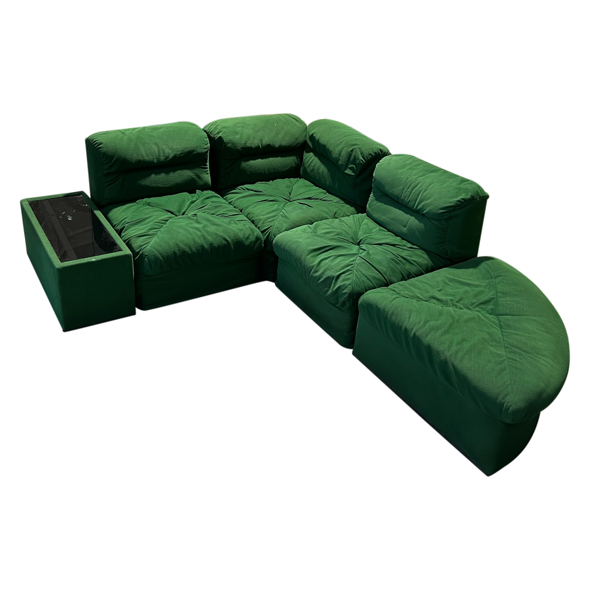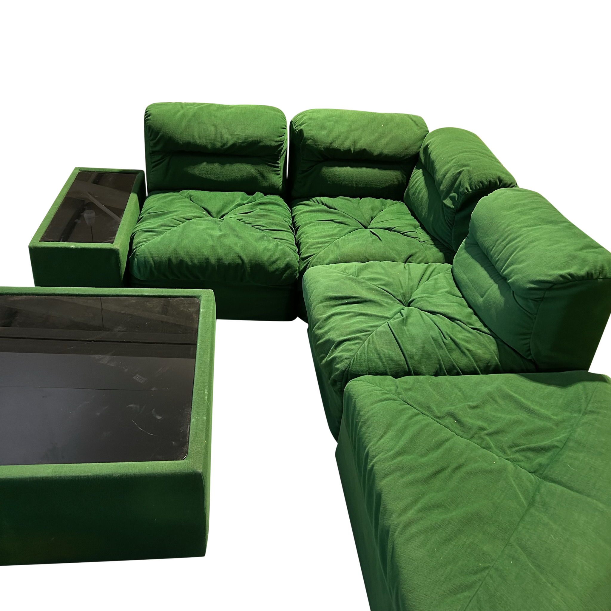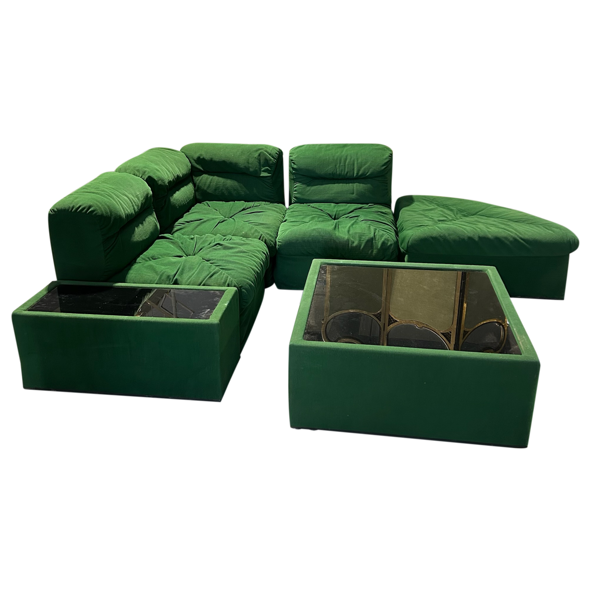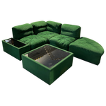 This piece is available for presale. Estimated arrival is mid to late January. A five piece lounge set in saturated emerald green with deep tufting and low seventies lines. Two corner seats, two armless seats, and a chaise build out the pit style silhouette, paired with two upholstered tables topped in smoked glass. A set for the art of play, defined by seventies Italian lounge culture.