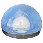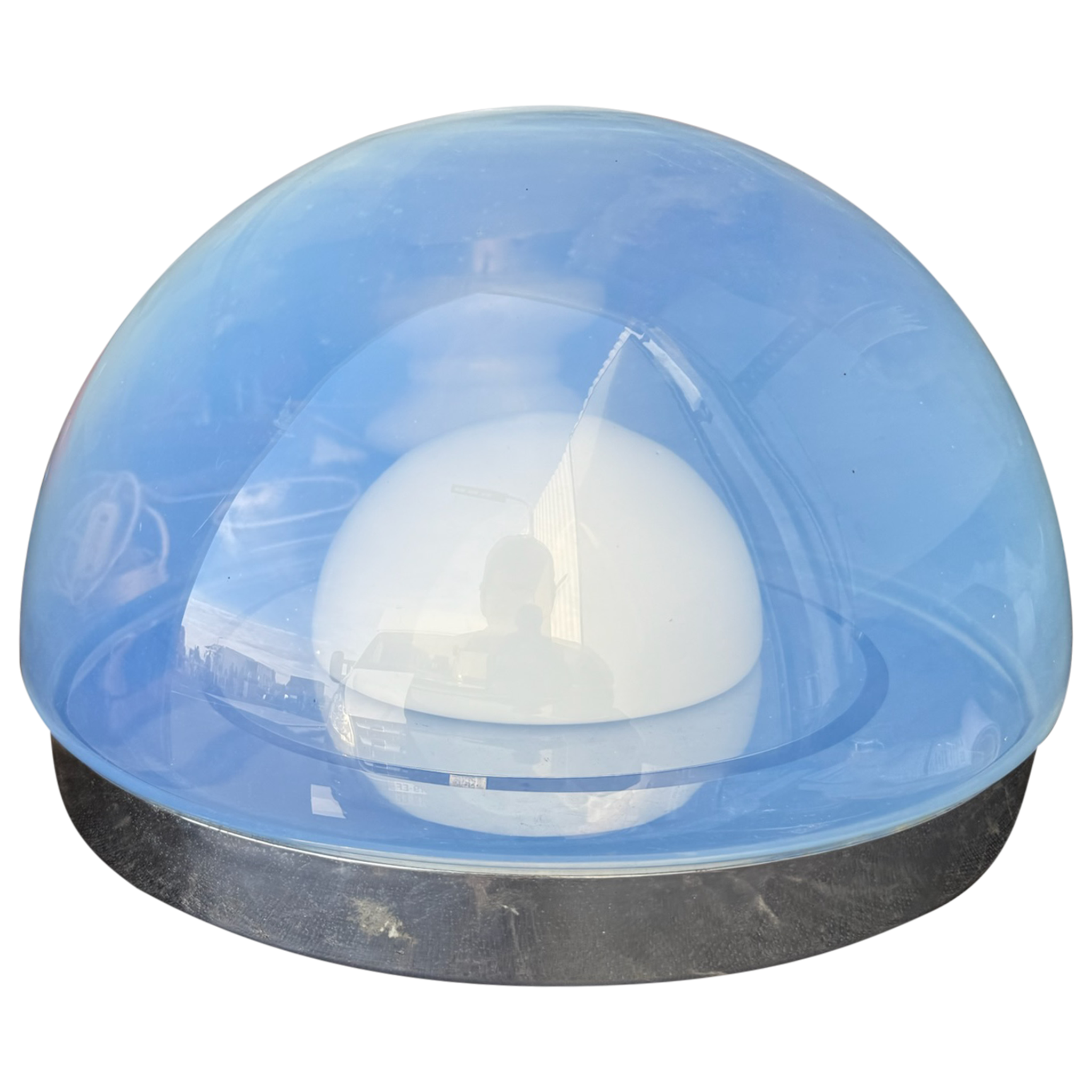 This piece is available for presale. Estimated arrival is mid to late January. A thick blown glass dome with a milky blue wash that shifts in the light, set over a weighted chrome base. The shade has a double layered build that creates that hovering inner orb, a detail typical of Italian Space Age lighting.