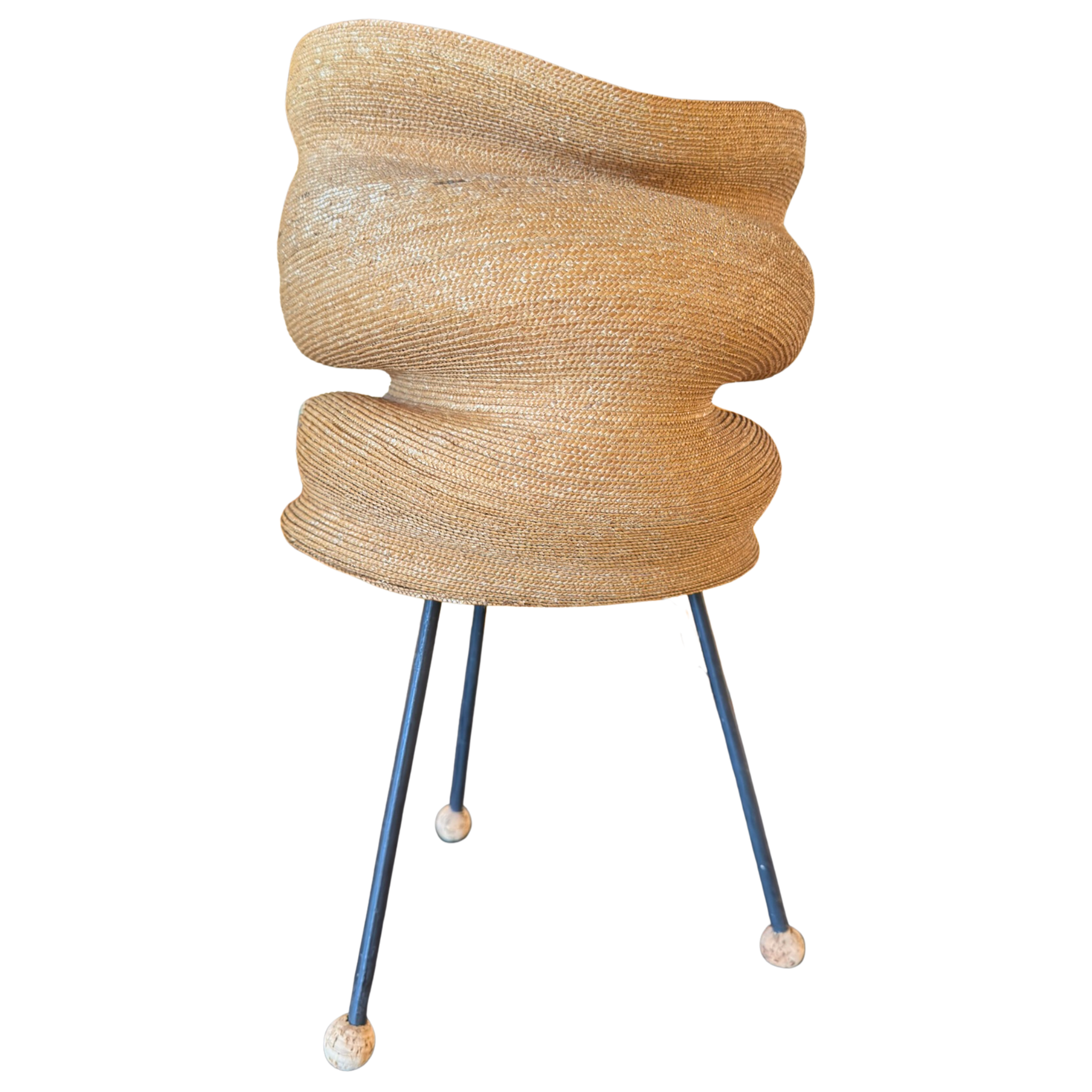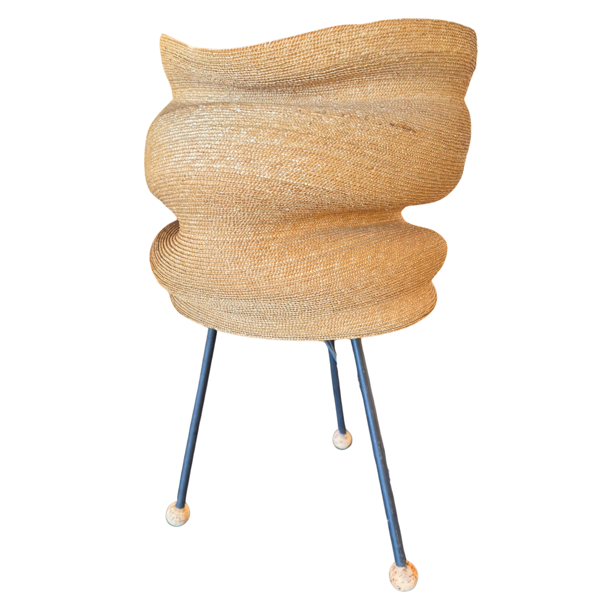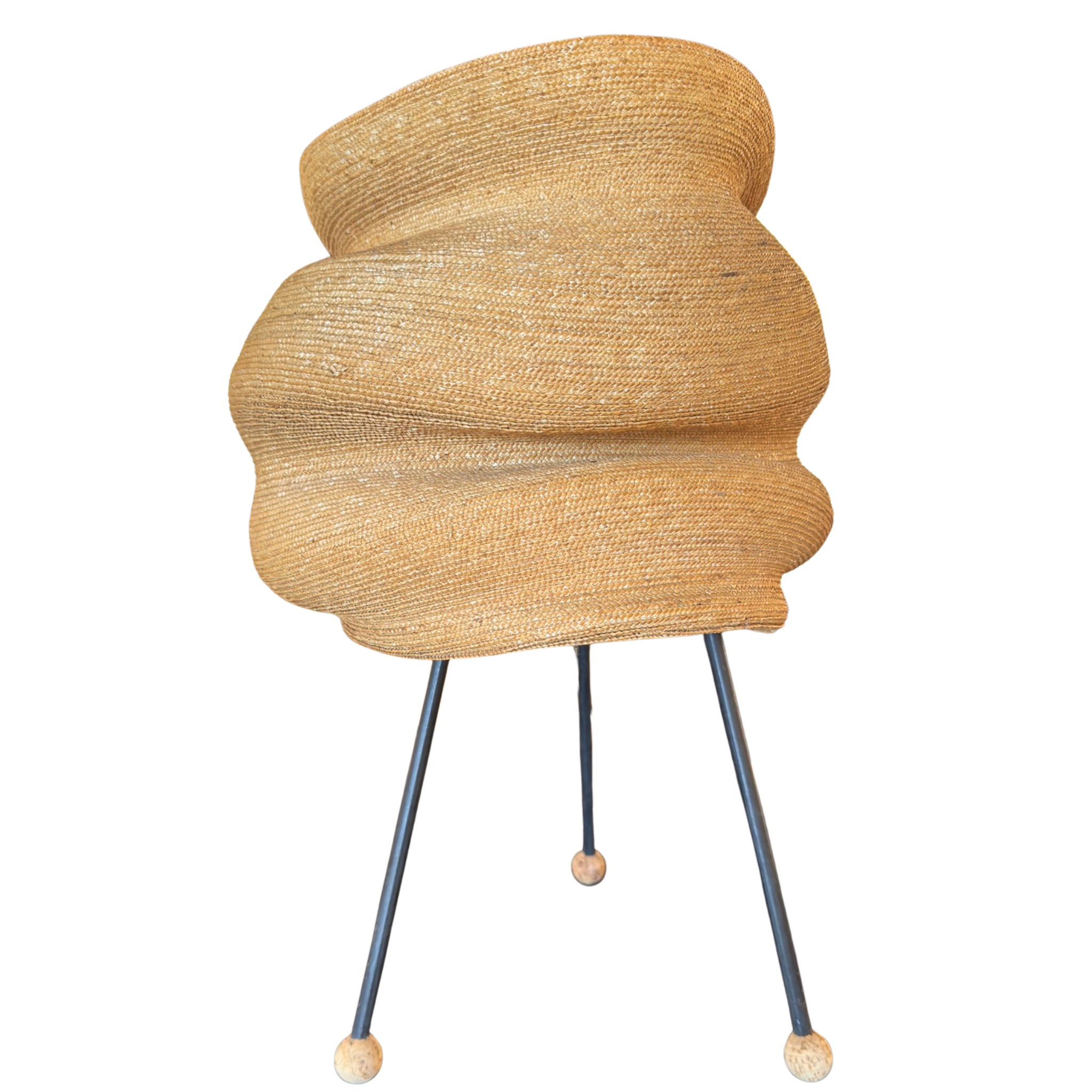Table lamp with a stacked woven fiber shade on three black metal legs. Each leg is finished with a small cork ball foot.