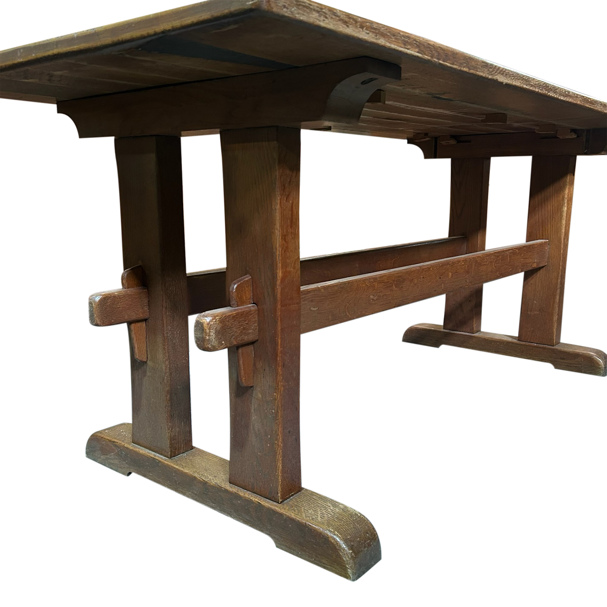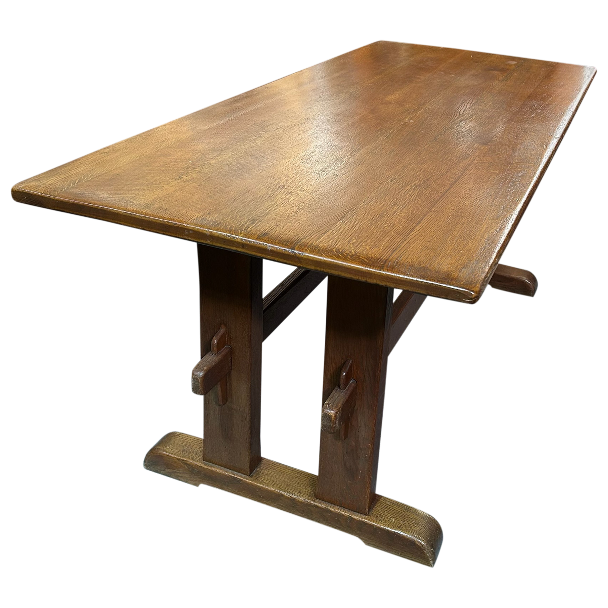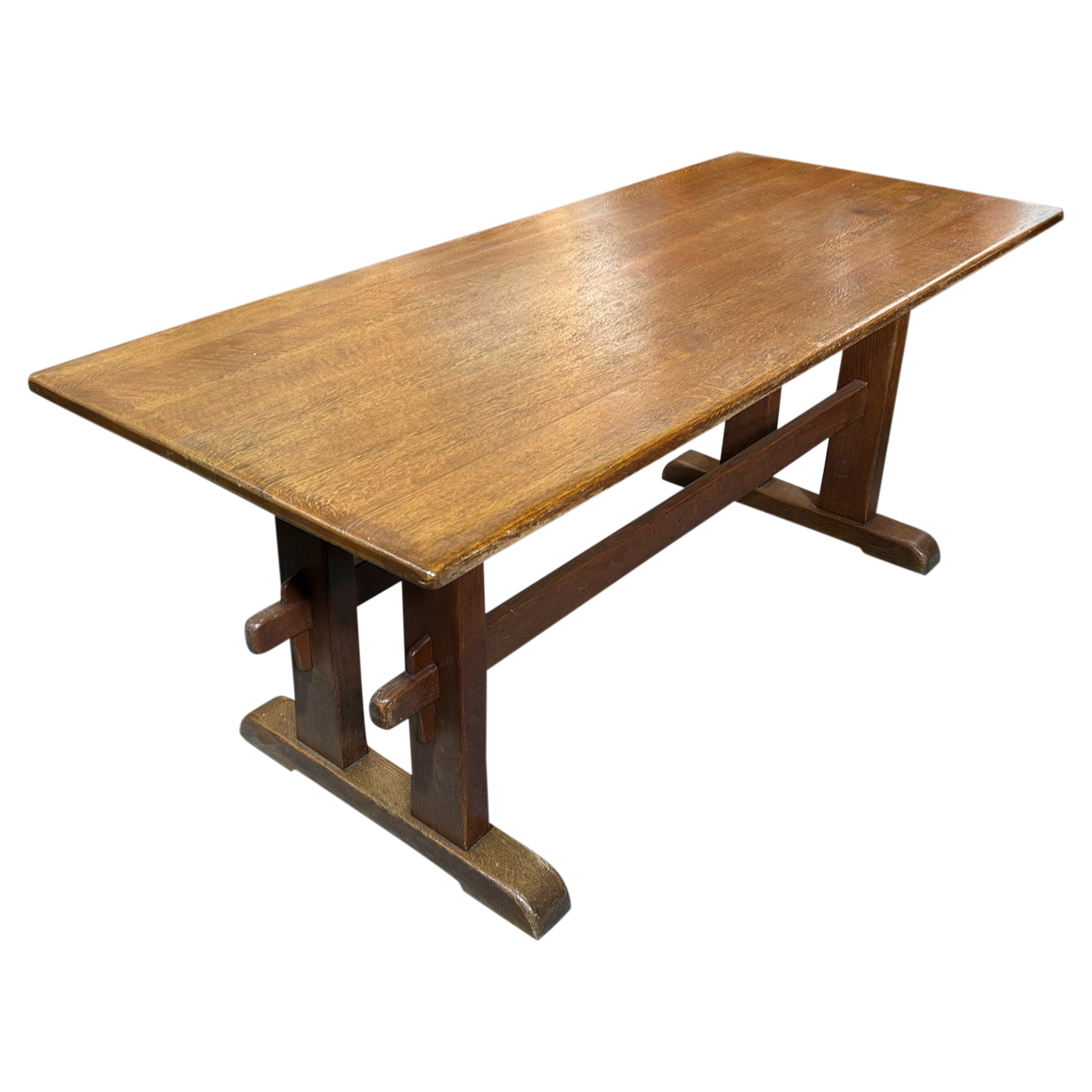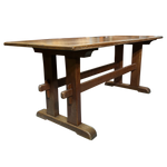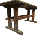 This piece is available for presale. Estimated arrival is mid to late January. Aged oak trestle table with a thick rectangular top and a warm, even patina. The pegged supports and wide feet show straightforward provincial craftsmanship, with visible grain and wear that reflect long use.