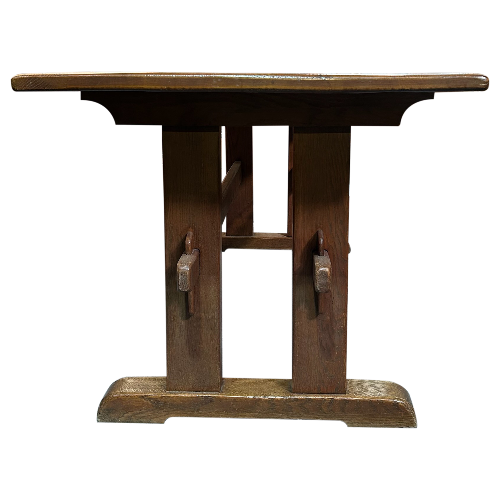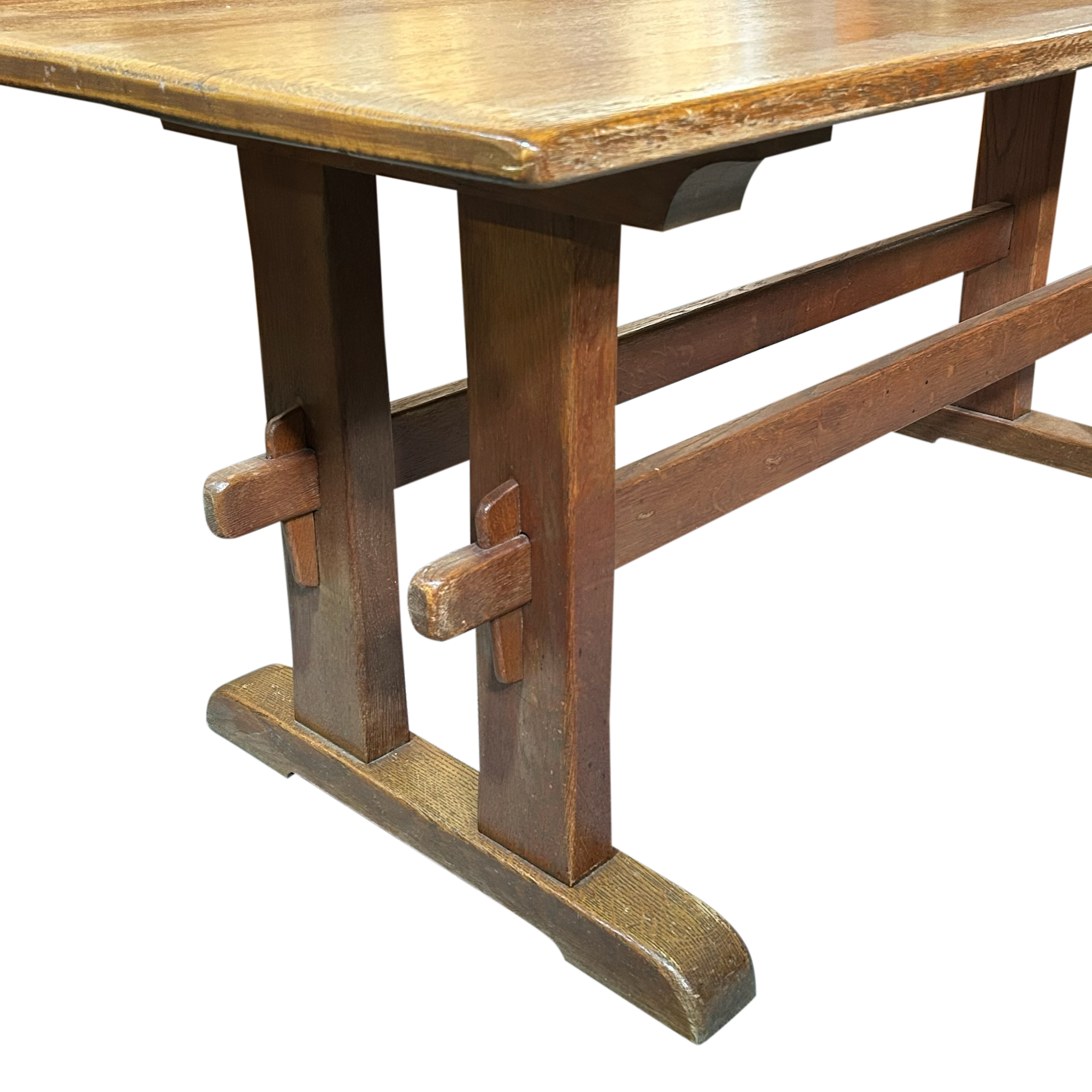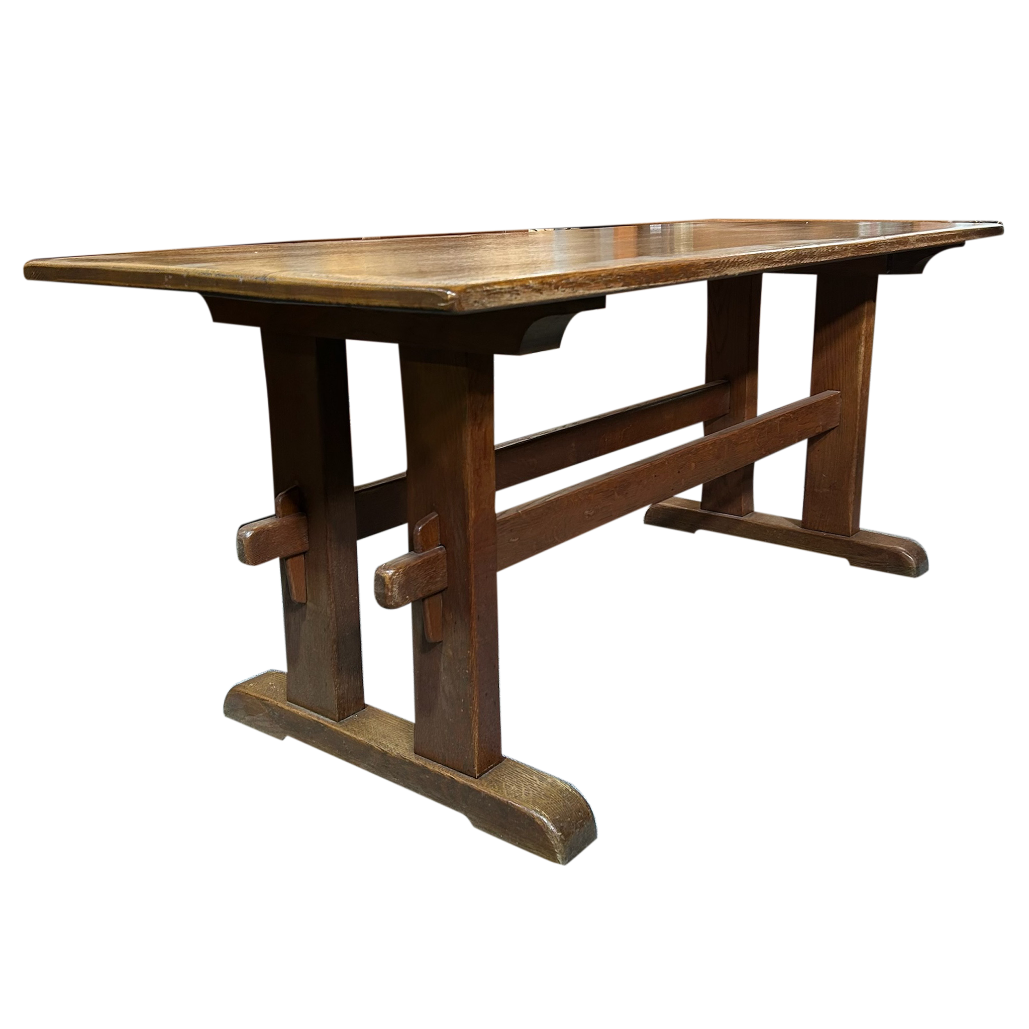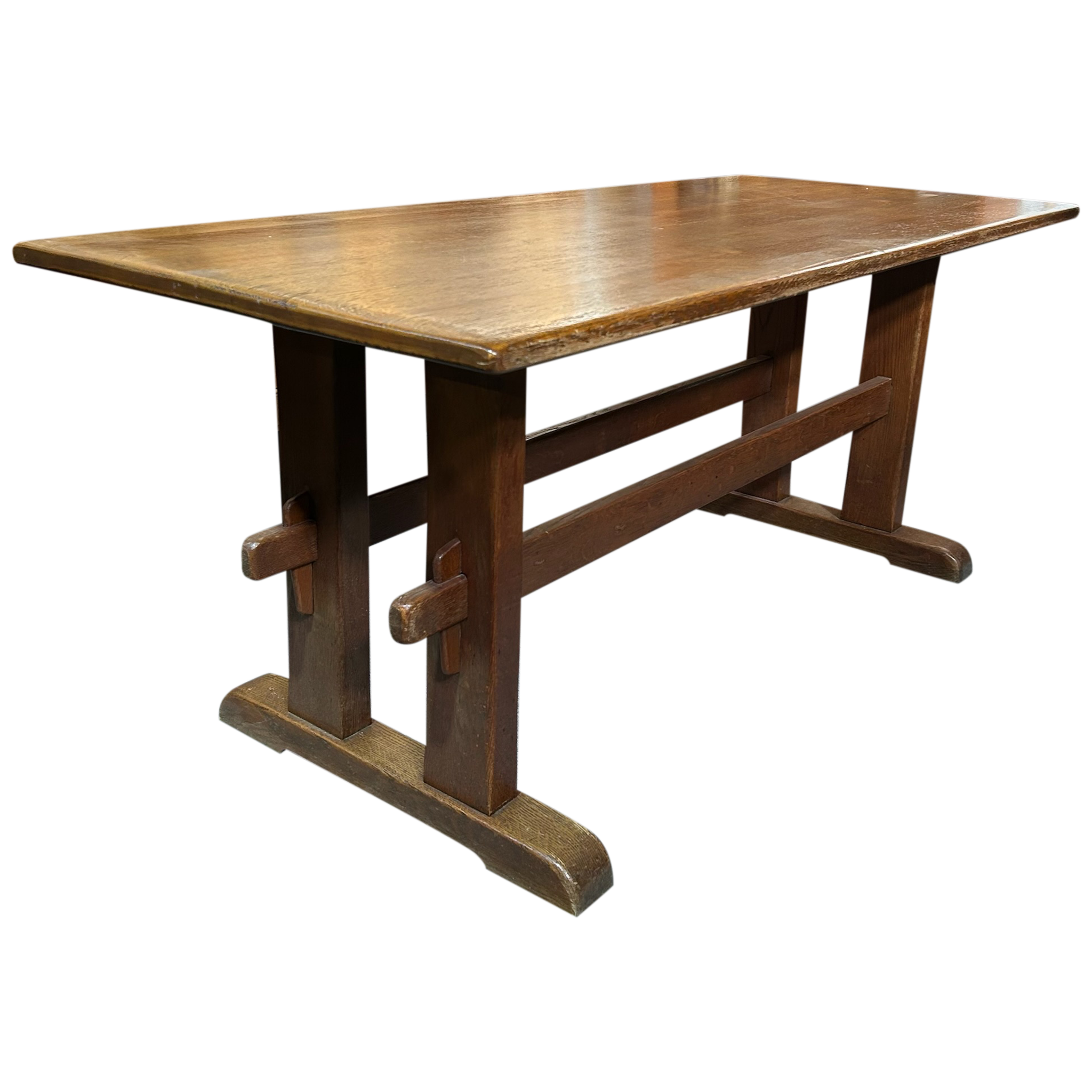 This piece is available for presale. Estimated arrival is mid to late January. Aged oak trestle table with a thick rectangular top and a warm, even patina. The pegged supports and wide feet show straightforward provincial craftsmanship, with visible grain and wear that reflect long use.