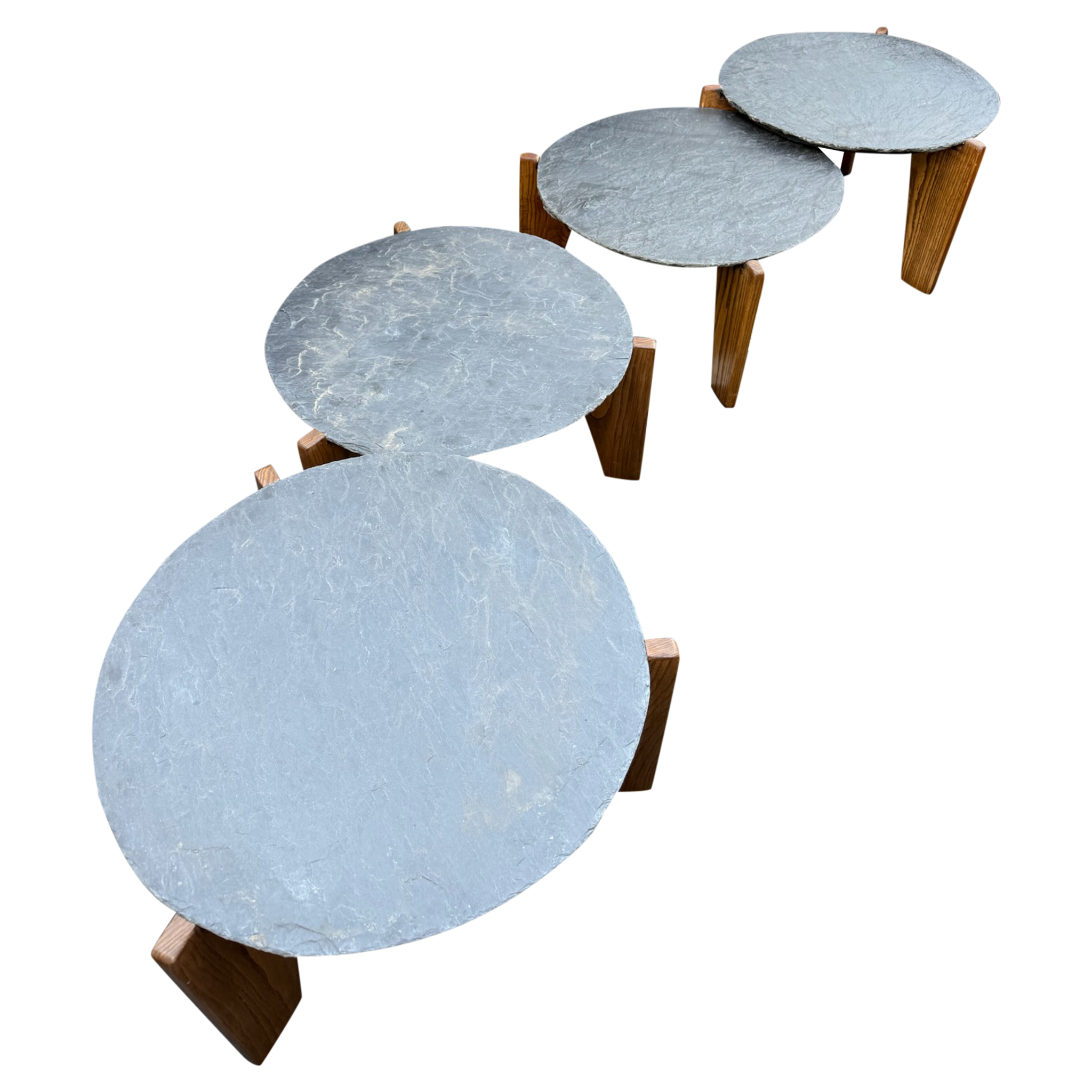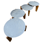 This piece is available for presale. Estimated arrival is mid to late January. Two pairs available, sold individually. Each pair features slate tops on solid oak legs. The slate has a rough, natural surface, and the oak bases use a simple three leg cut typical of French seventies workshop furniture.