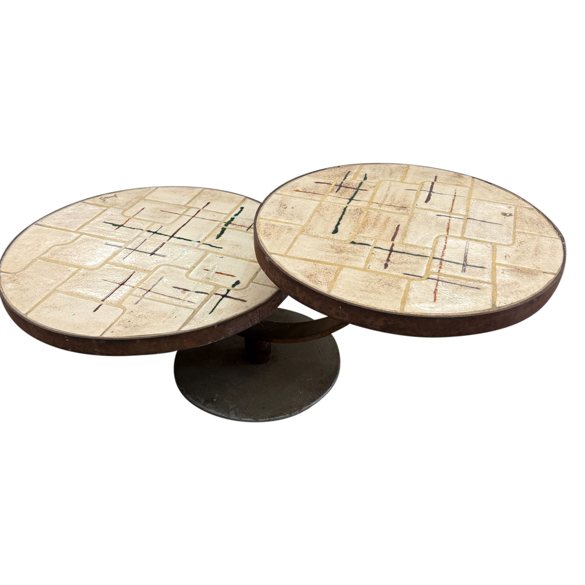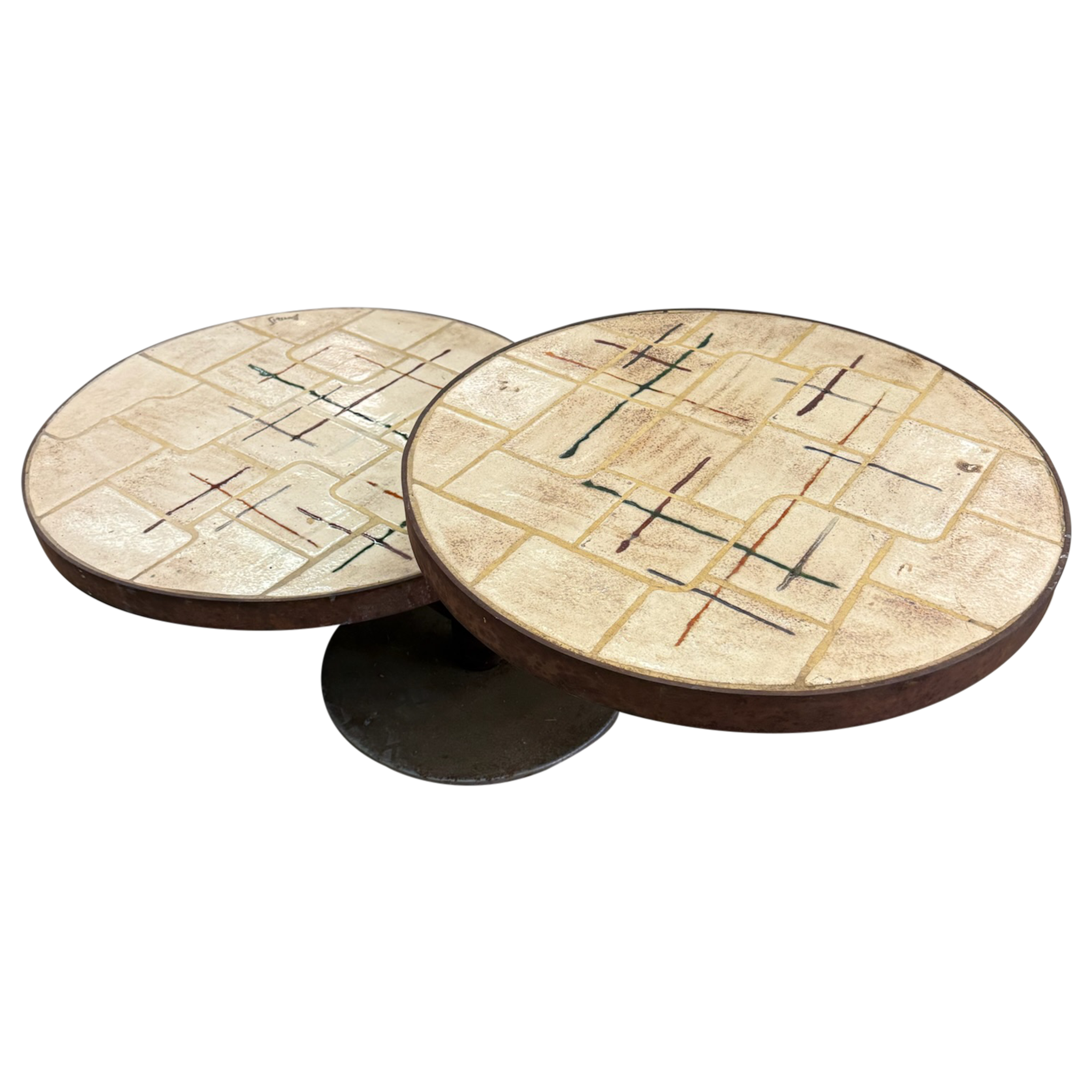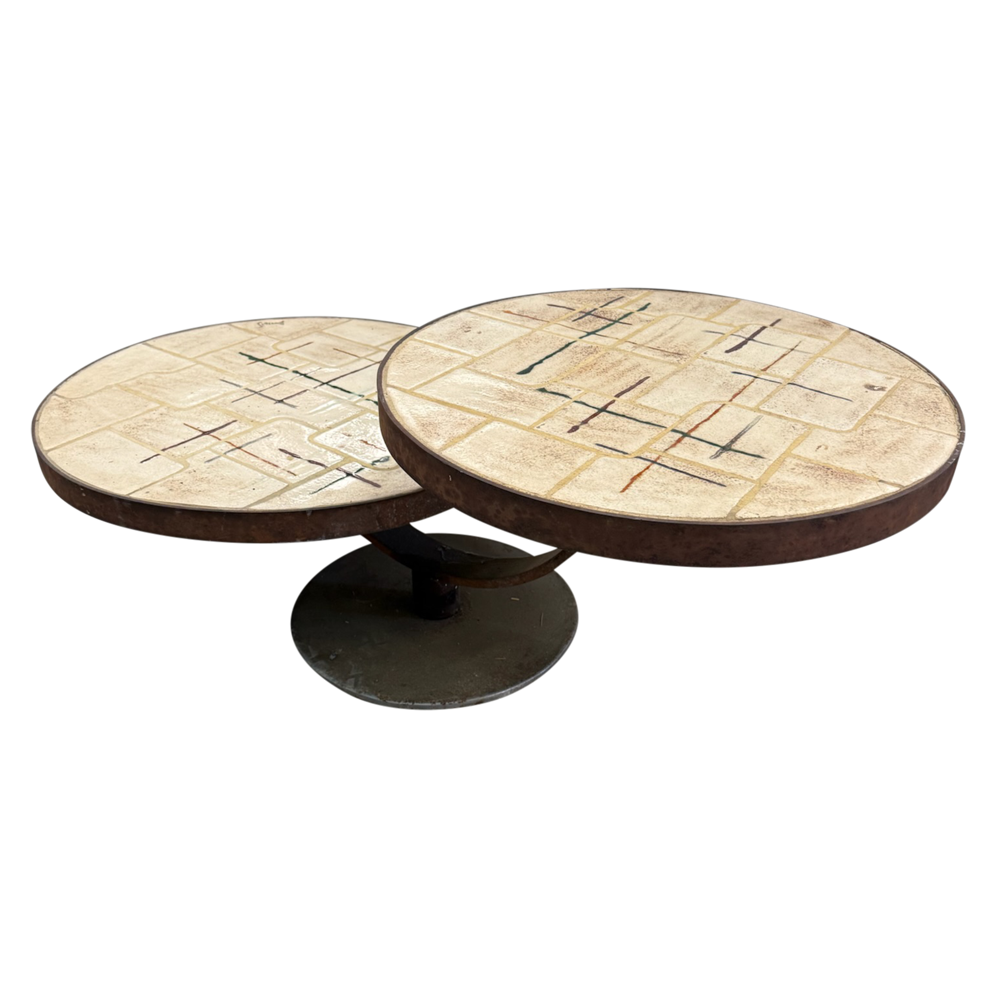 Vintage French Dual Round Tile Top Coffee Table, 1960s