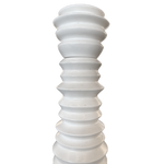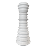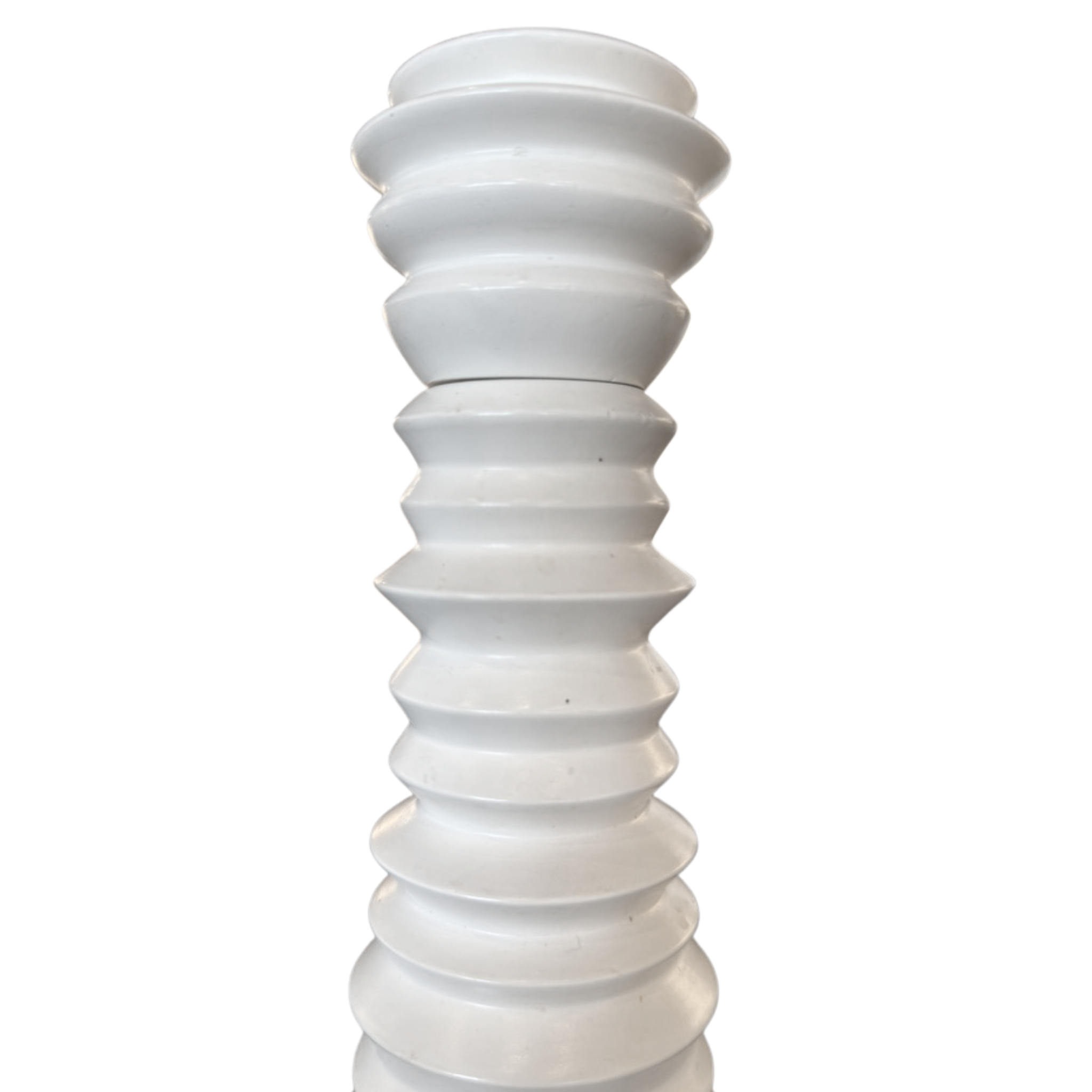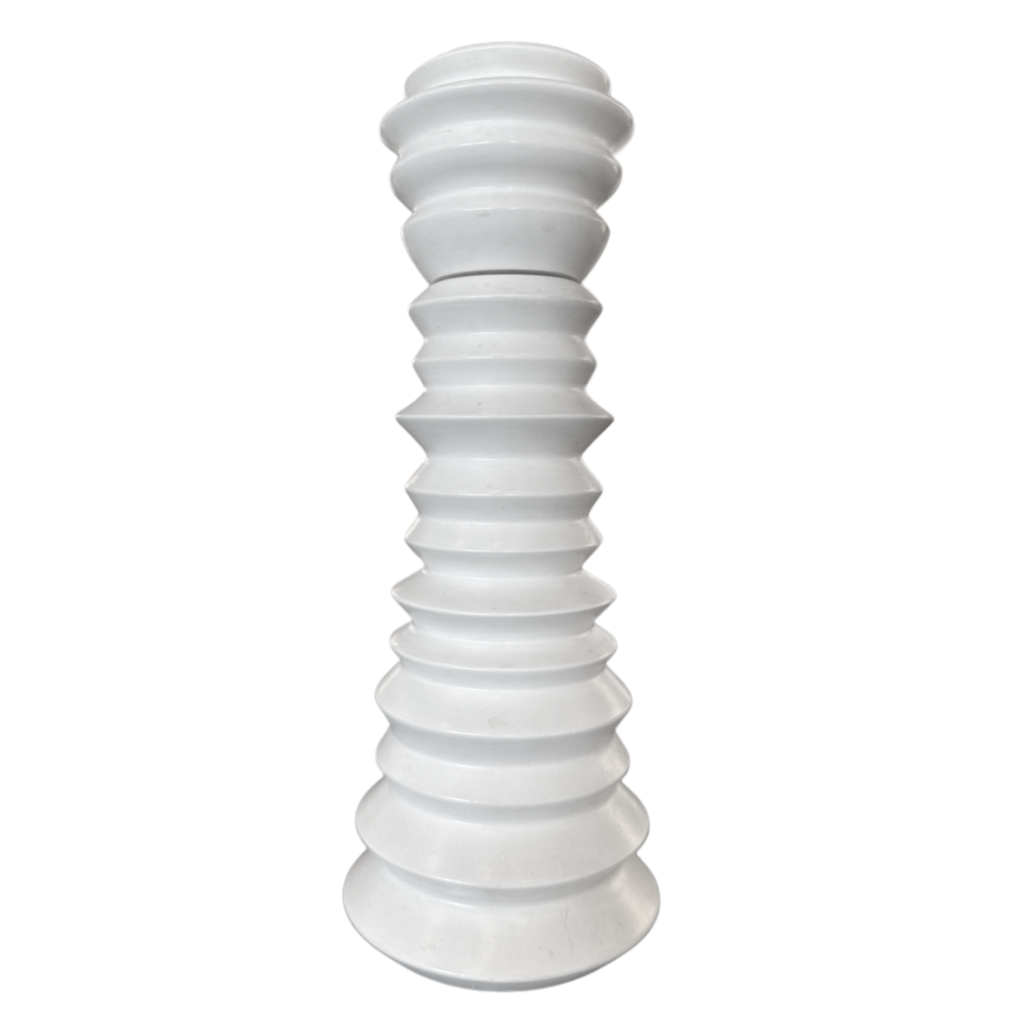 Tall sculptural pepper grinder in cream painted wood, defined by a stacked ring silhouette that alternates slim ridges with rounded tiers.