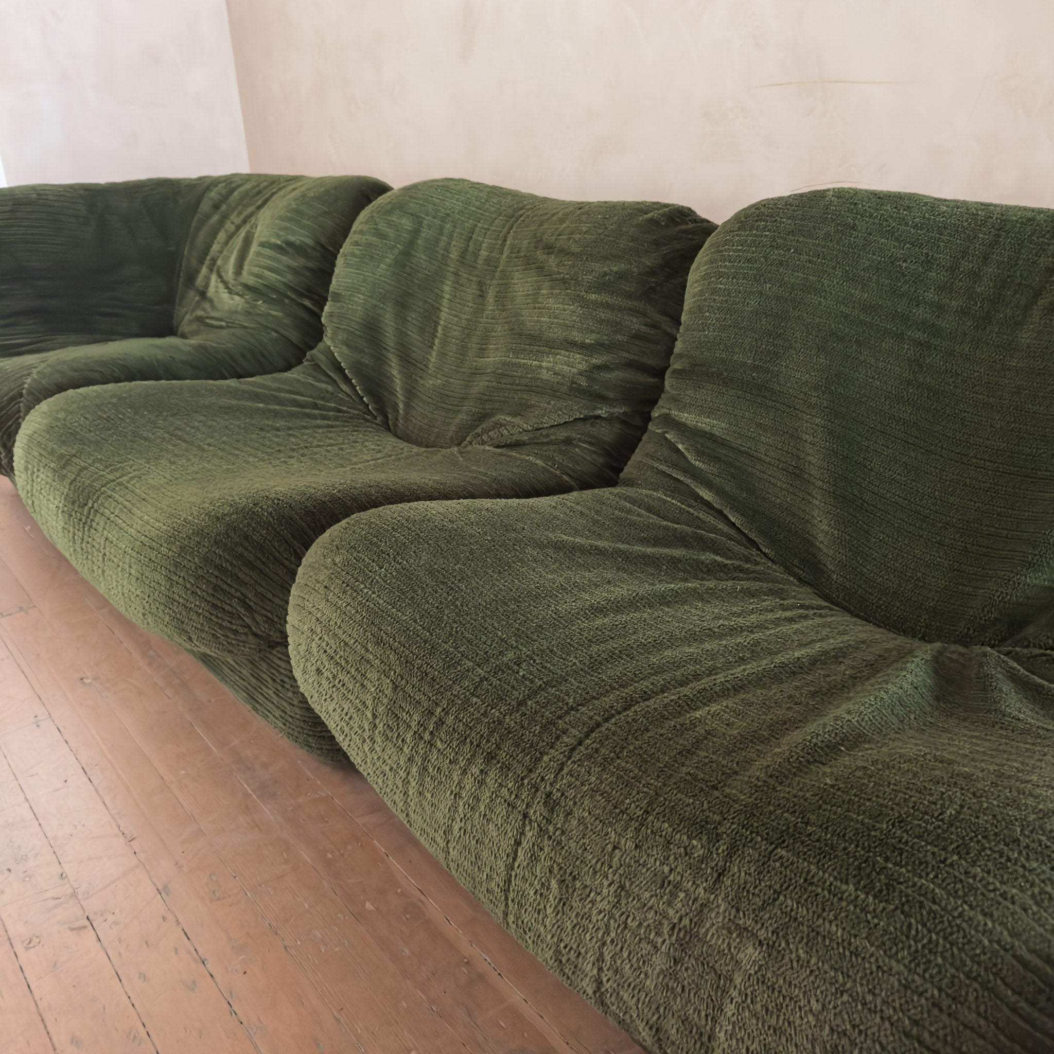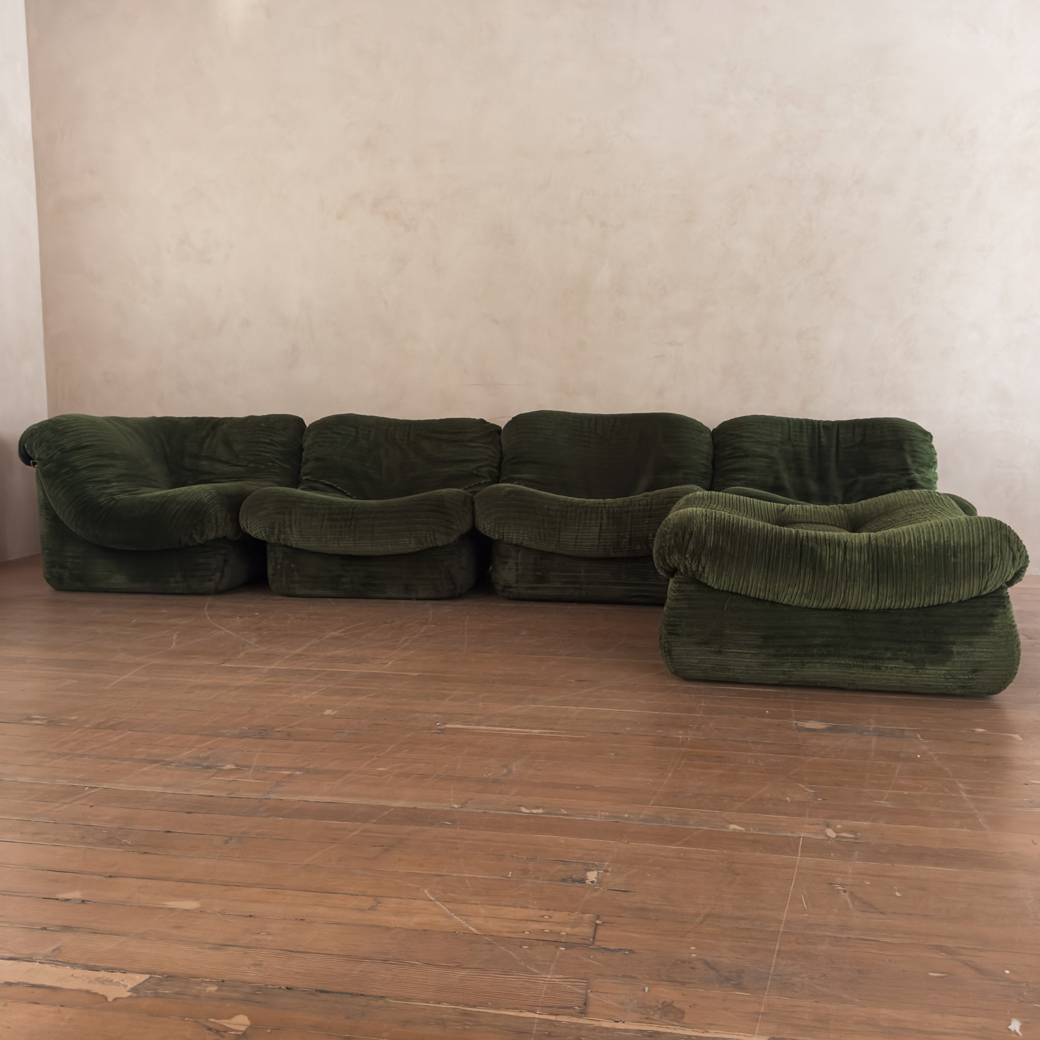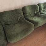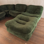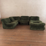 A five piece lounge set in original striking olive green plush fabric.