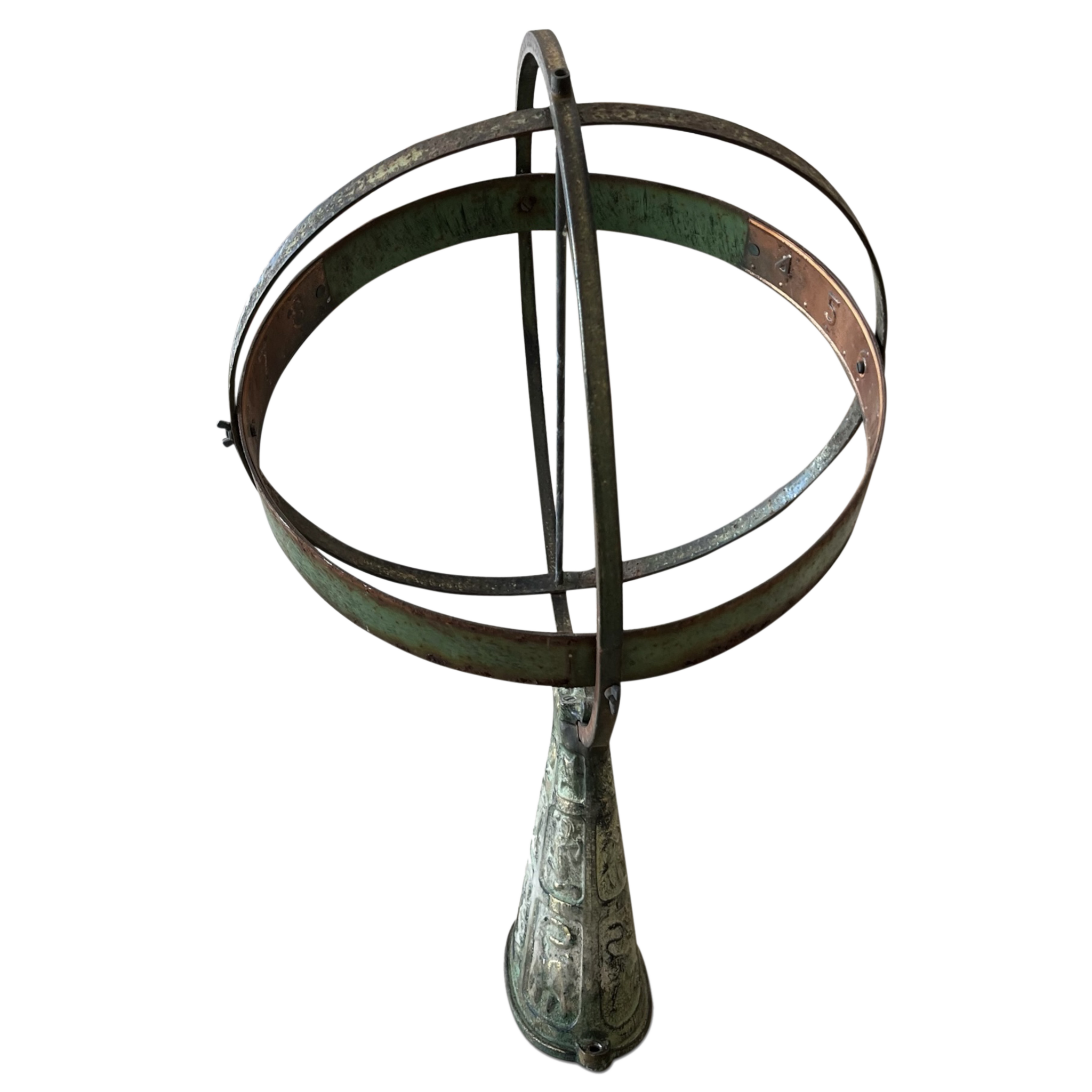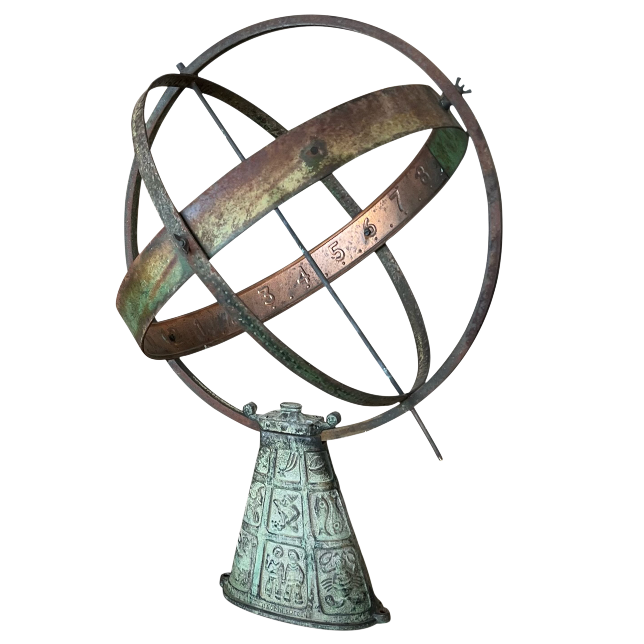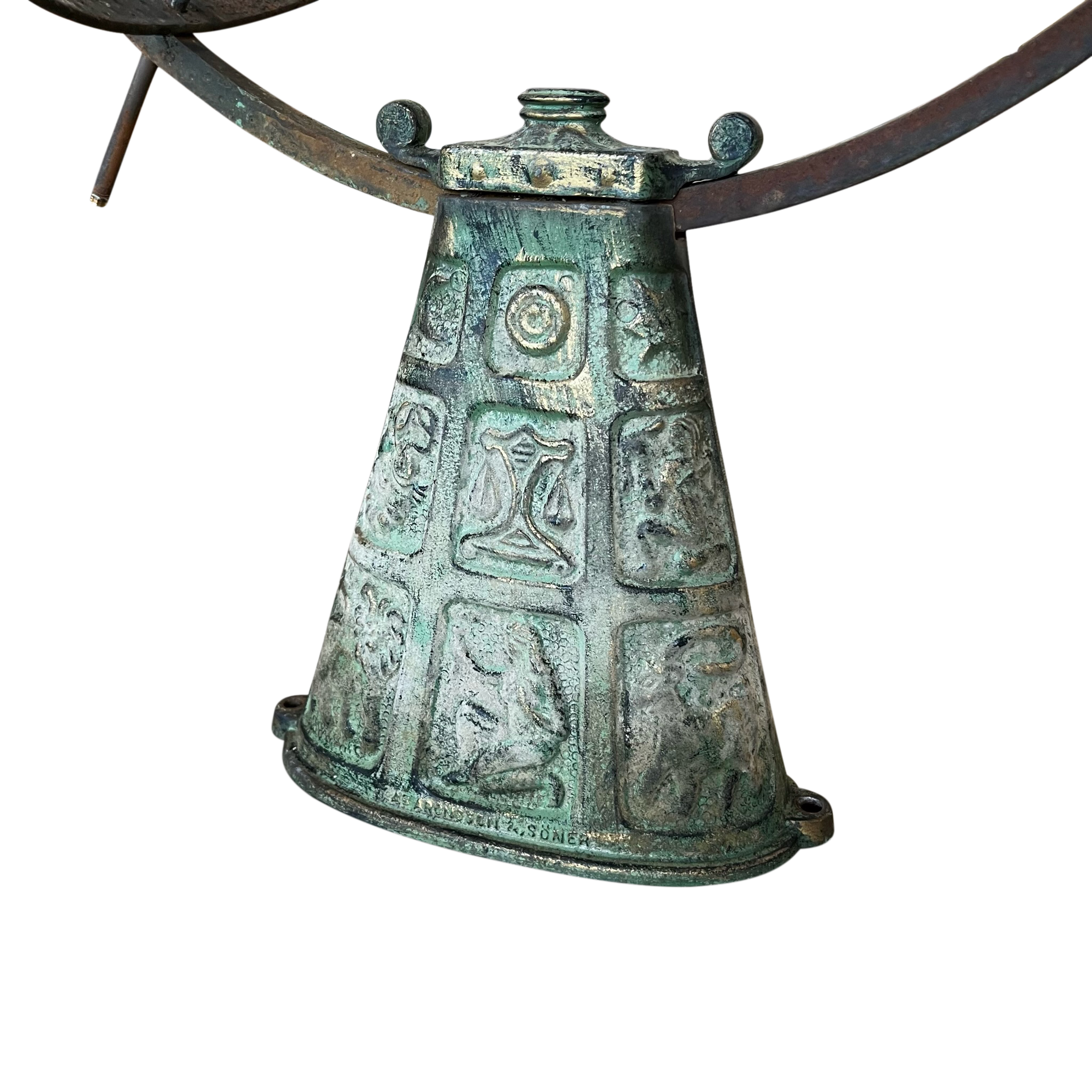 A beautifully aged bronze sundial featuring intricate zodiac engravings. The patina adds depth and character with both artistic and functional appeal.