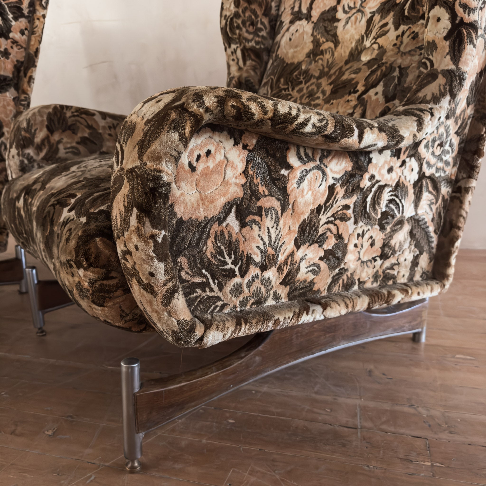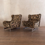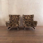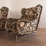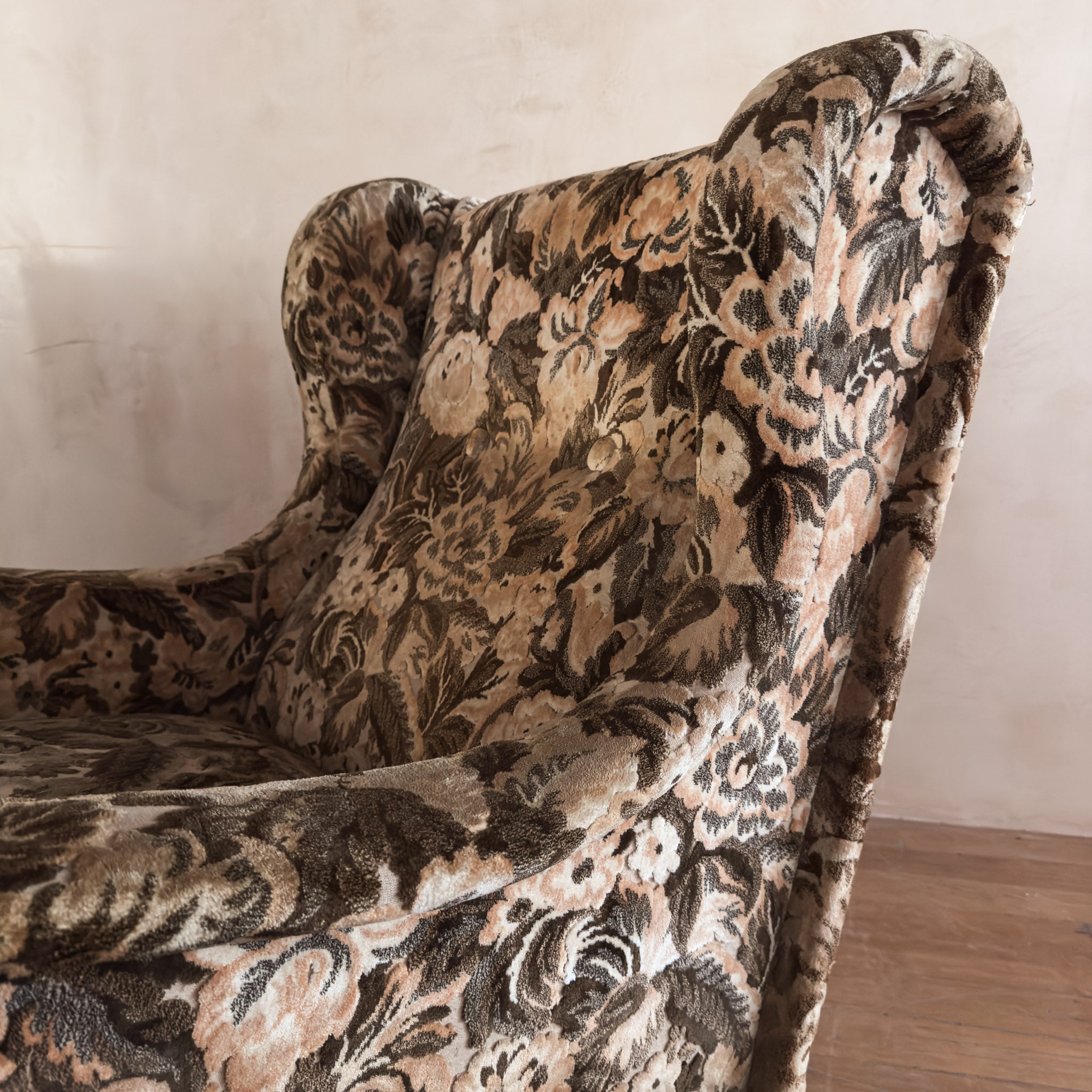 This piece is available for presale. Estimated arrival is February 20th. A pair of wide seated wingback chairs upholstered in a dense floral velvet with warm gold and brown tones. The silhouette is soft and relaxed with rolled arms and deep cushions, set on wood and chrome legs that give the vintage fabric a sharper contrast.