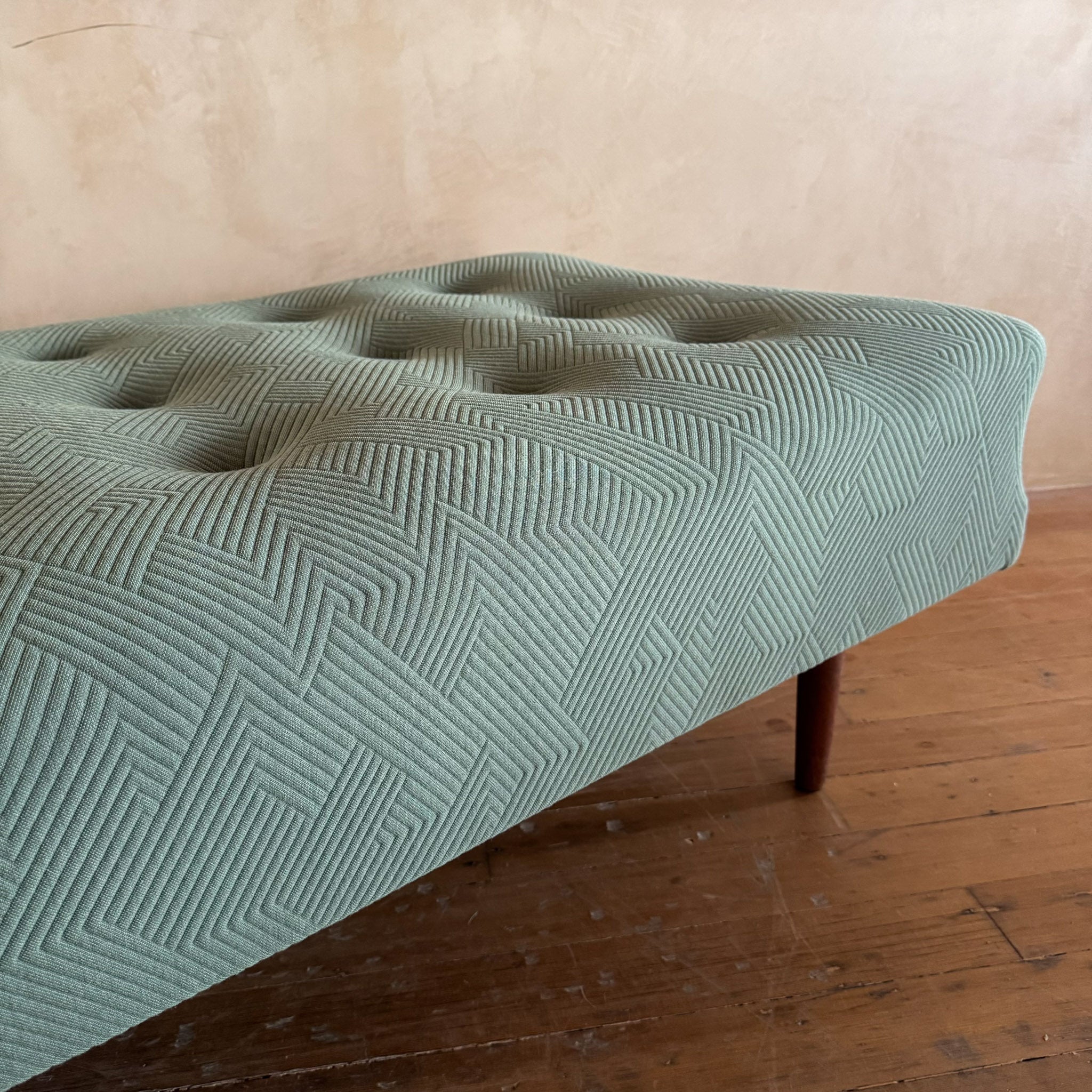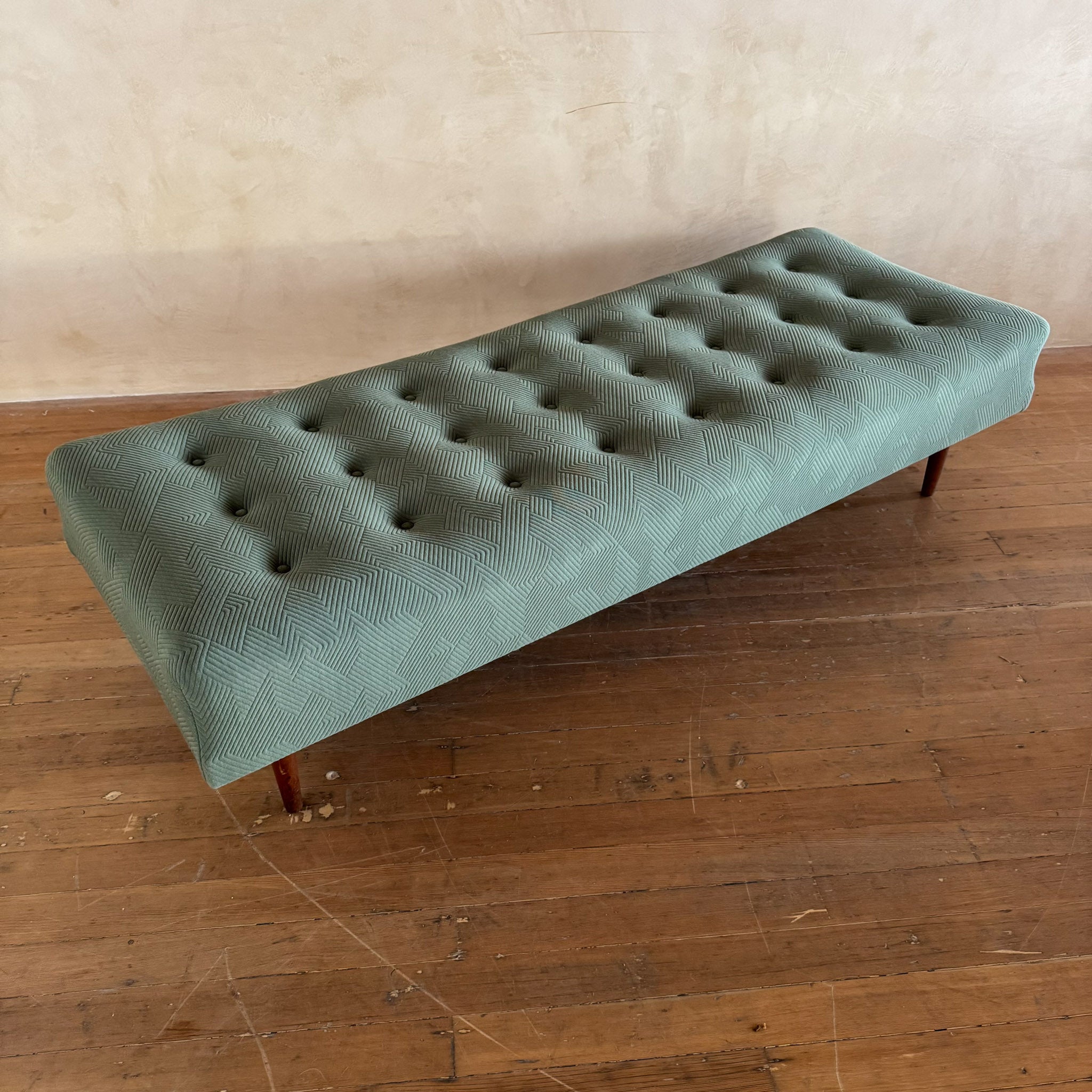 Low, elongated daybed with original green upholstery in a tightly woven geometric tufted pattern. Set on tapered solid teak legs that add warmth and lift without breaking the classic mid century line.