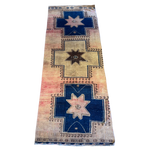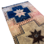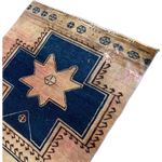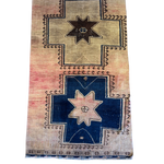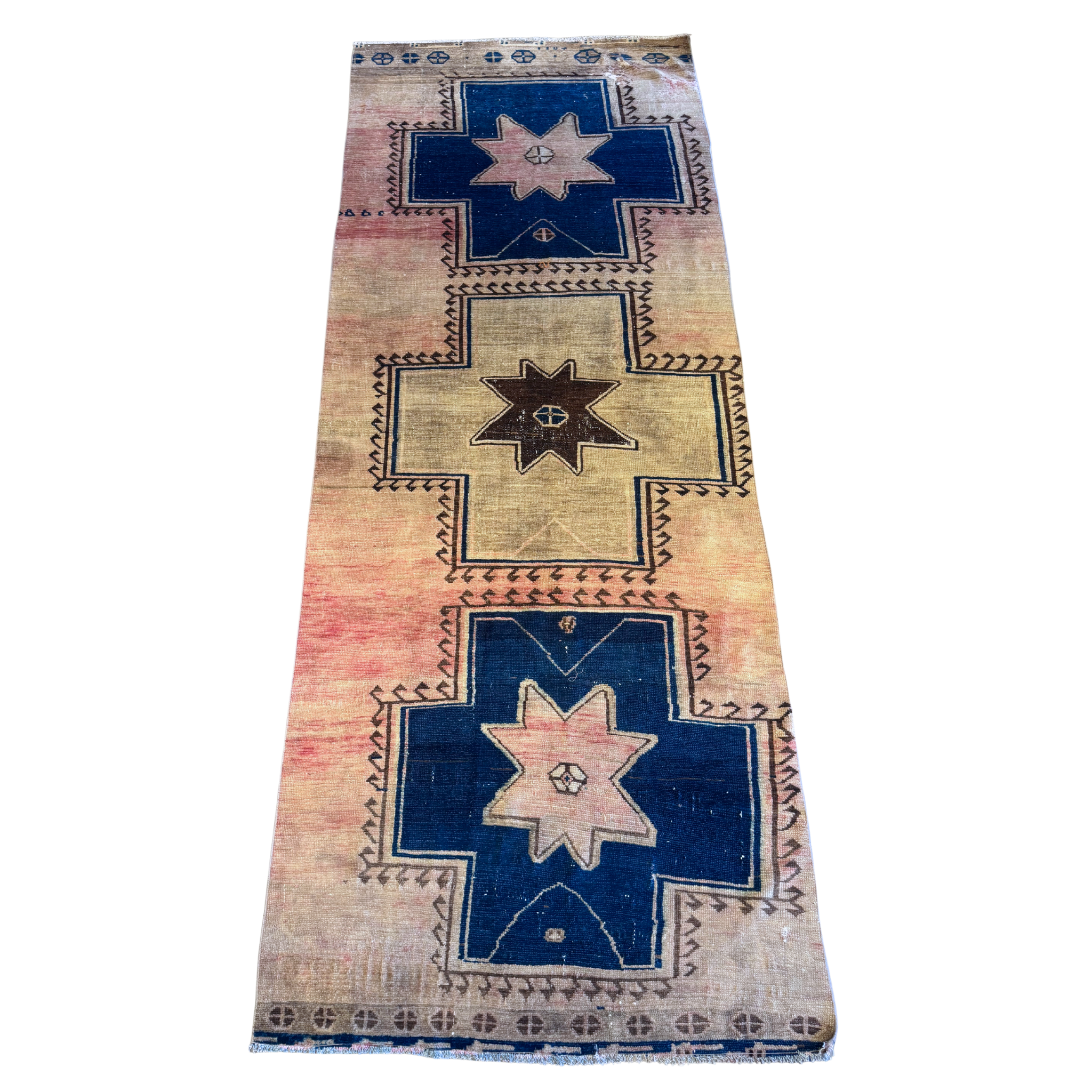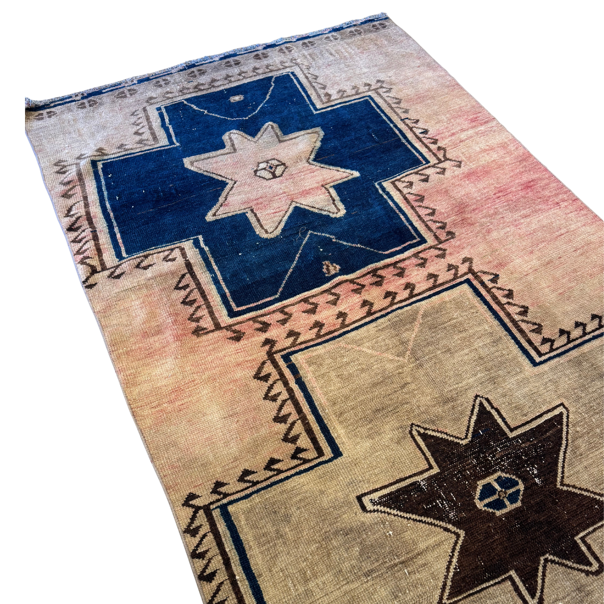 Handwoven Anatolian rug with star medallions in indigo, blush, and soft brown. Crafted from handspun wool with natural dyes, the rug’s flatweave construction reveals the nuances of age and traditional village weaving.