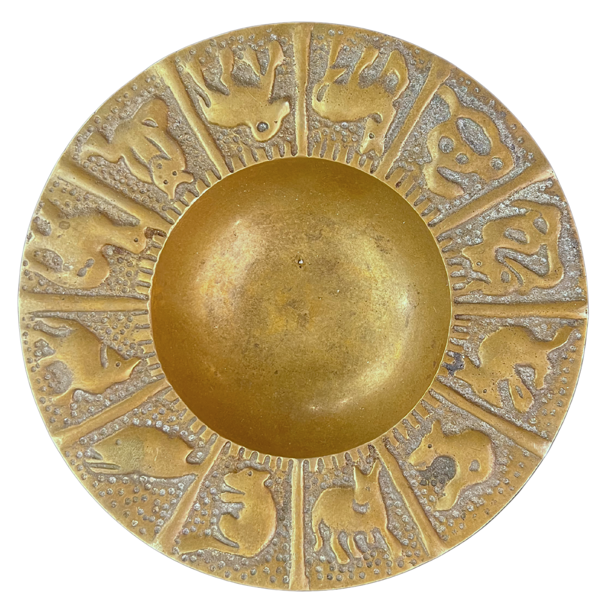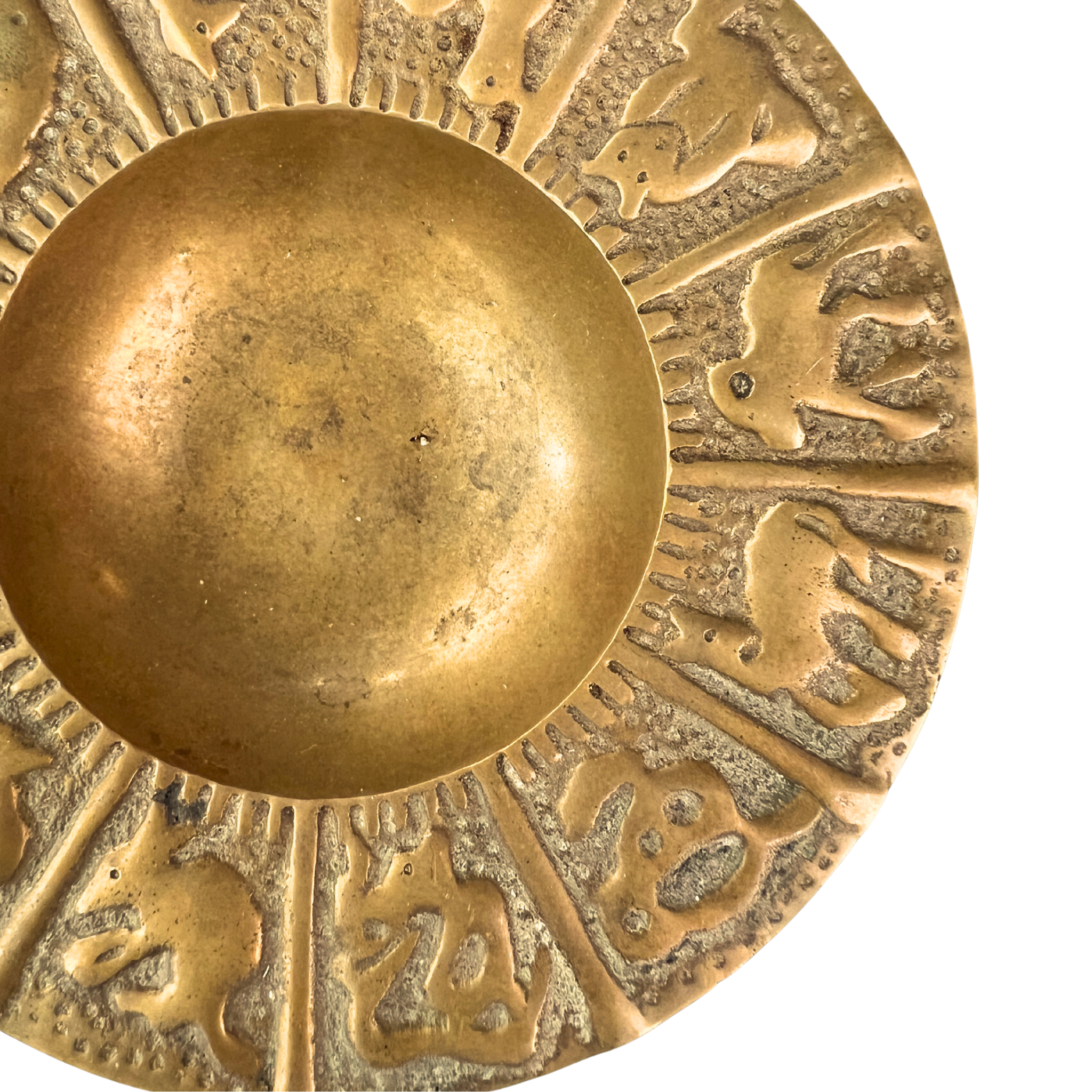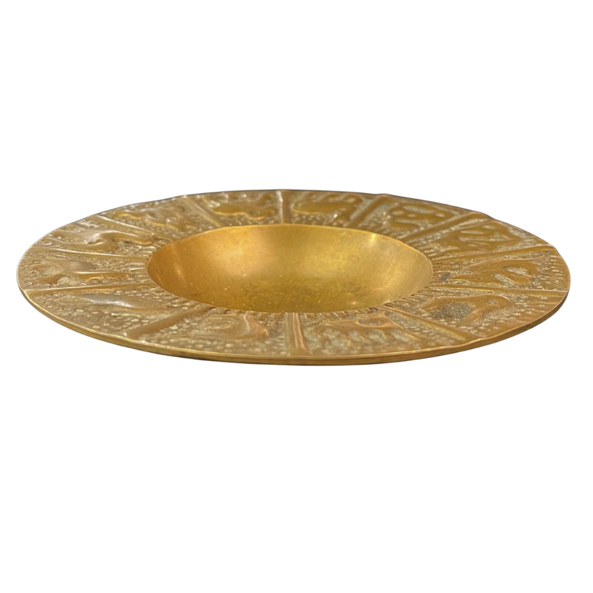 Wide rimmed brass catchall embossed with various animal motifs. Use as an ashtray, catchall, or decor.