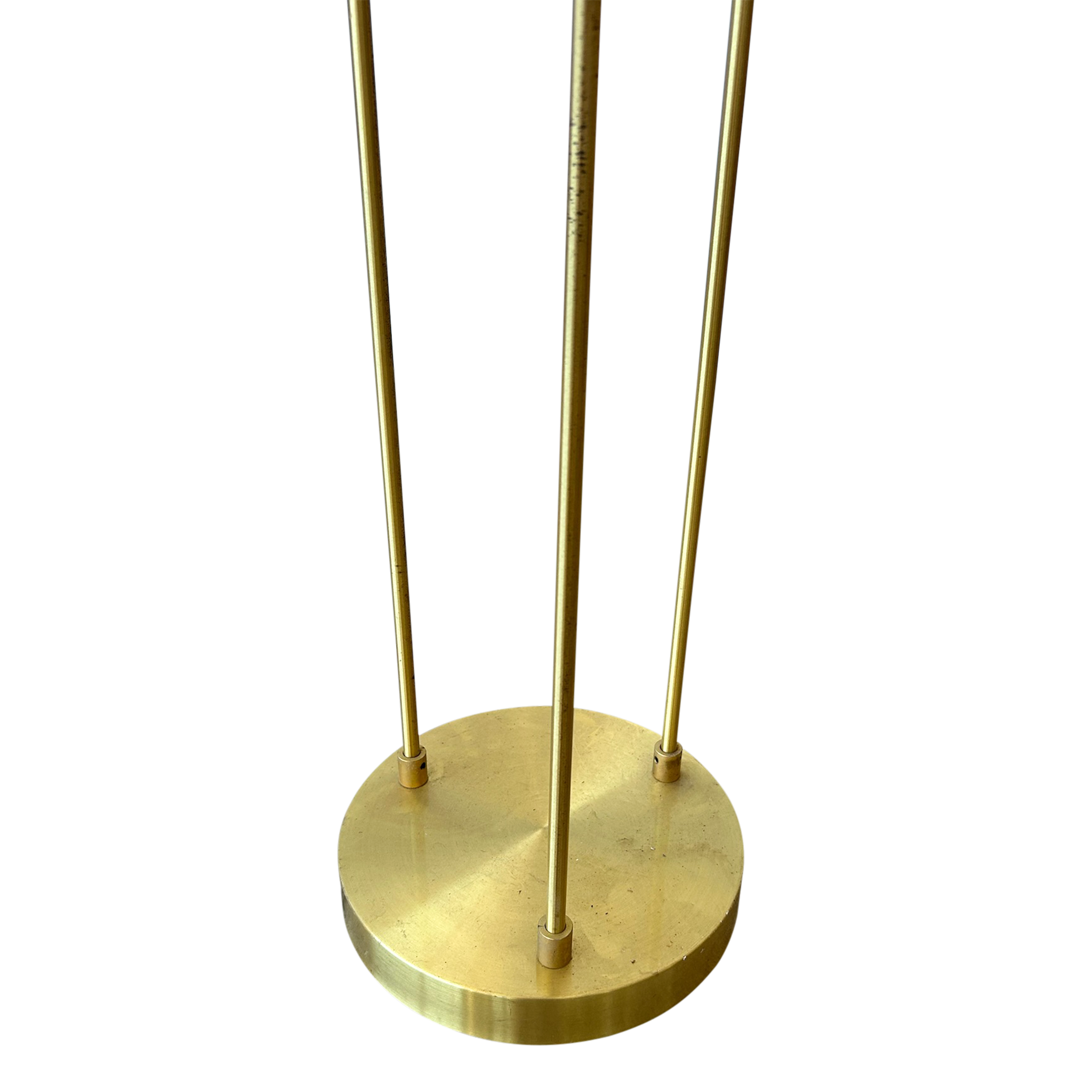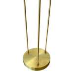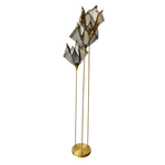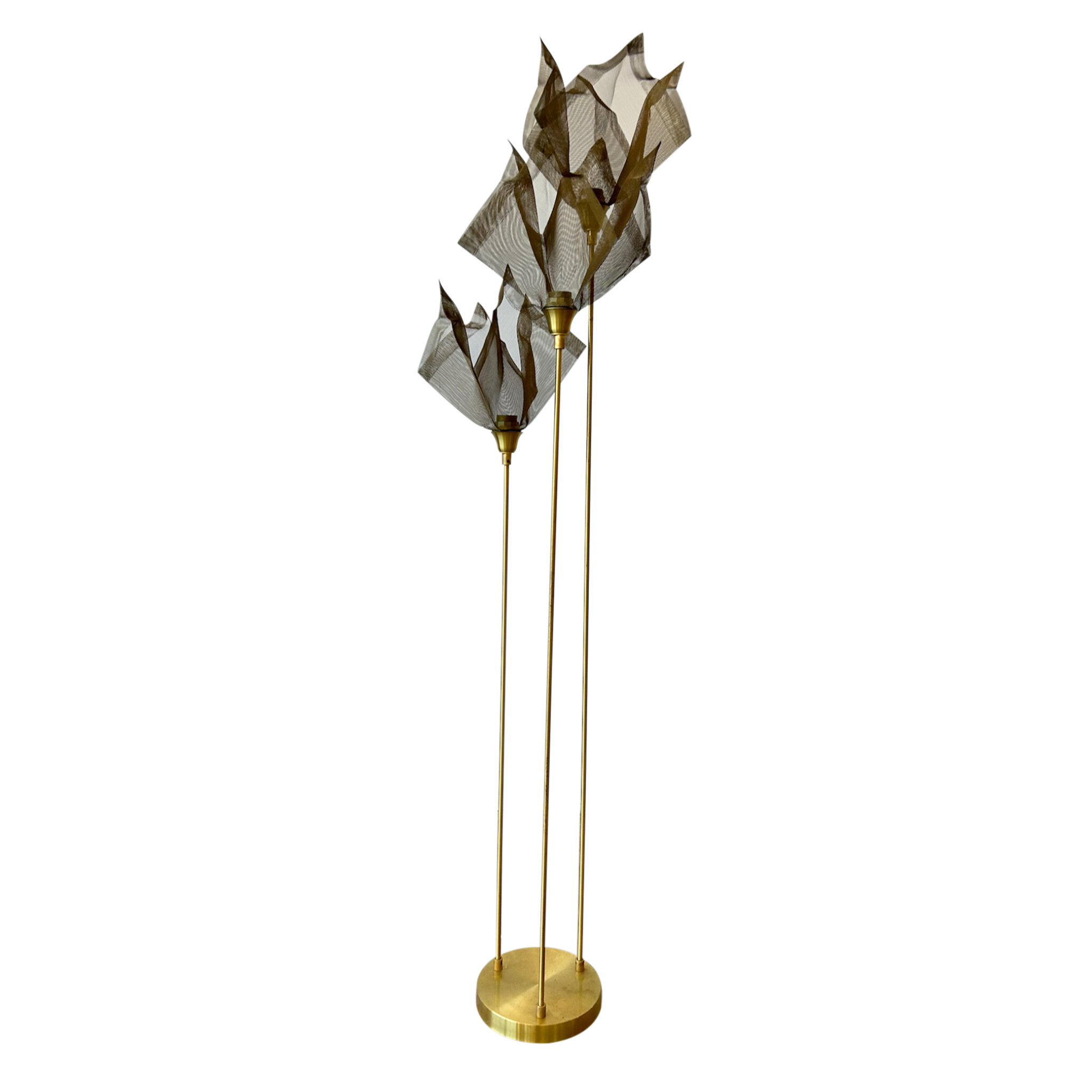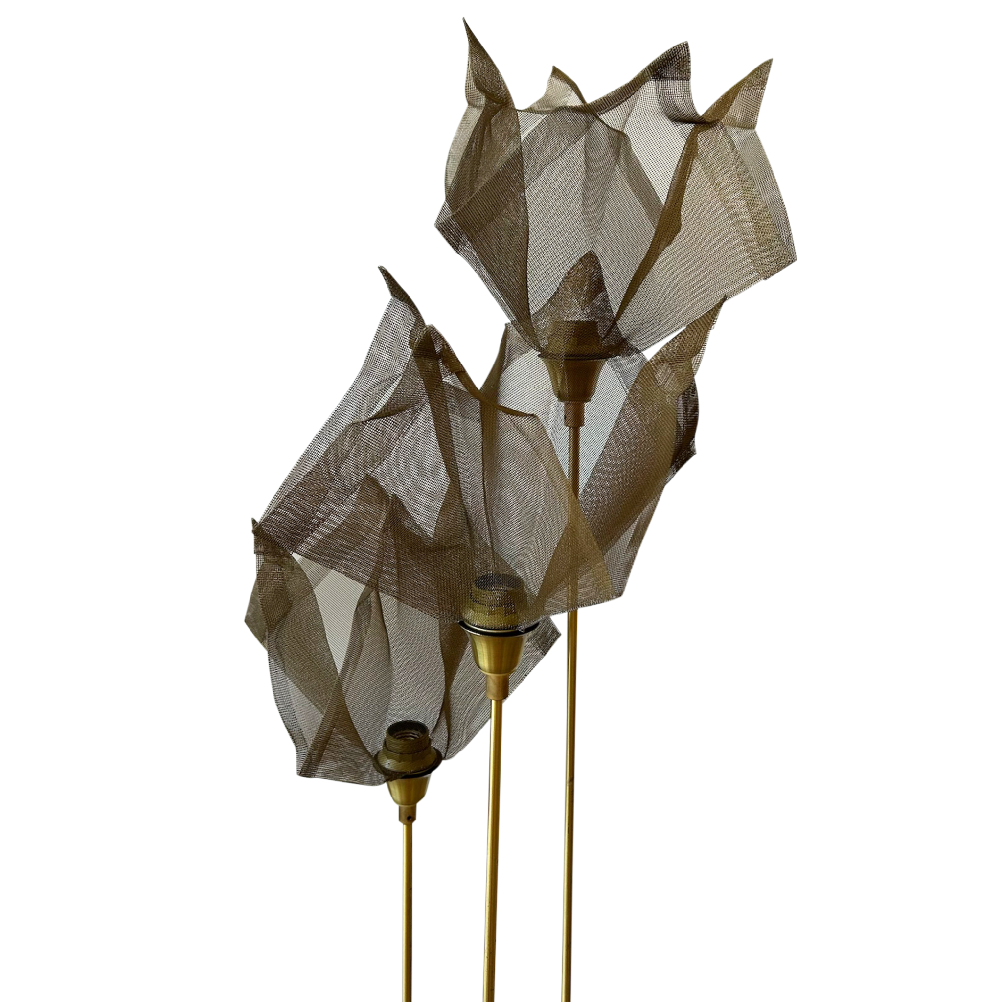 Brass base with three staggered stems, each topped with a mesh shade that folds and twists like metal in motion. Strong lines, industrial edge. Circa 1970s.